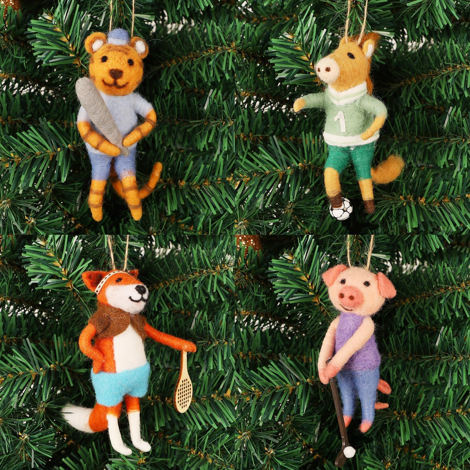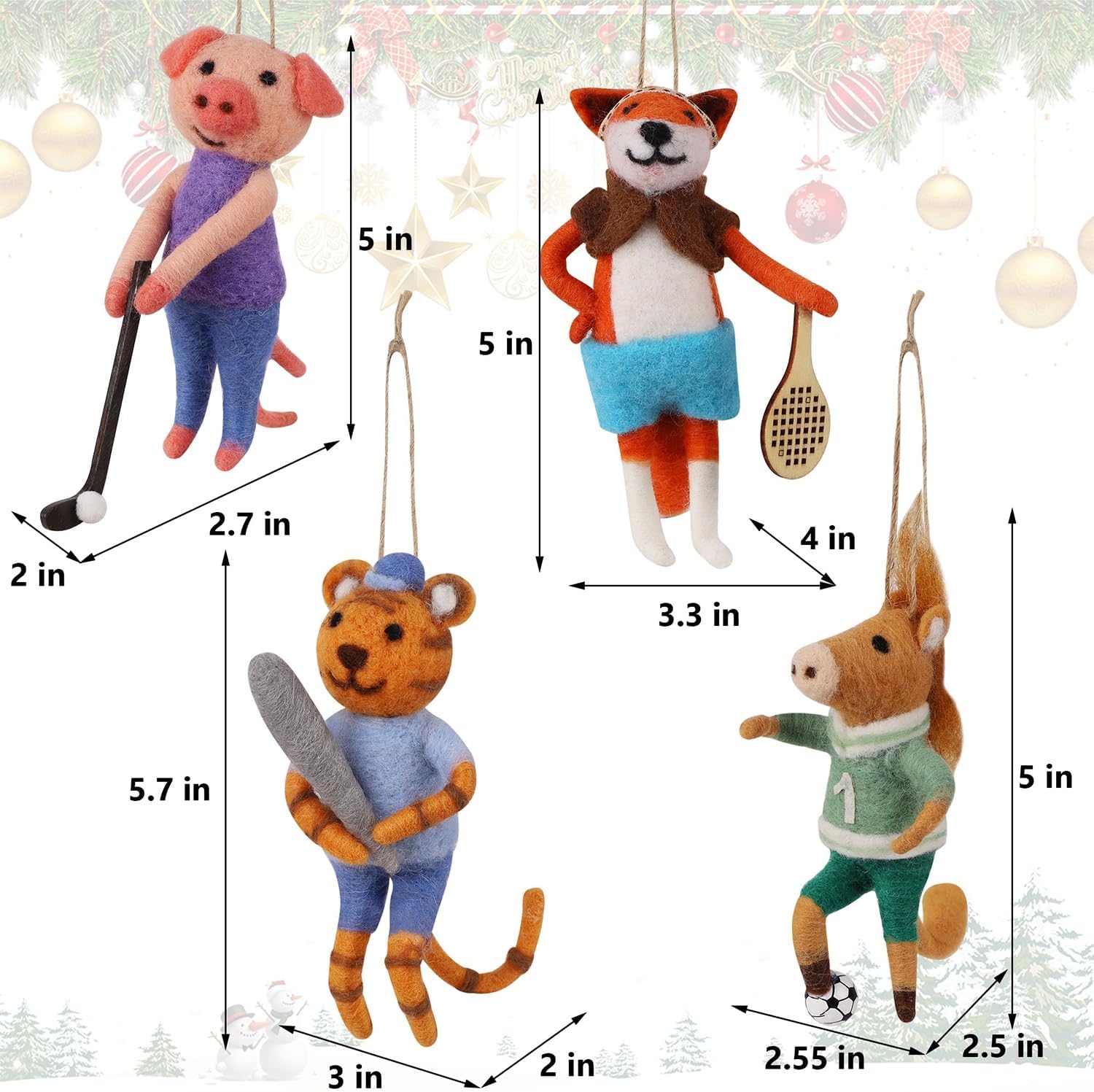 - CHRISTMAS FELT ANIMAL ATHLETES: This set includes four charming felt Athlete Animal ornaments - include pig, tiger, fox and horse, each showcasing unique expressions and poses, perfectly capturing the whimsical spirit of the holidays and adding a touch of cuteness to your Xmas decor. The size approx. 2.7" X 2.5" X 5". Notes- It is for decoration, not a toy for children