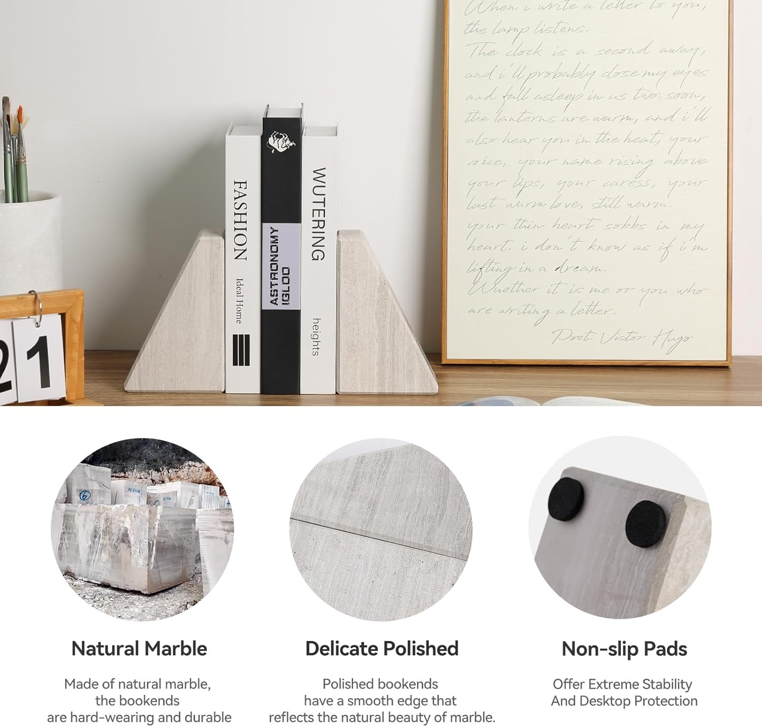 Marble Book Ends for Heavy Books, Decorative Bookends for Shelves, Durable and Heavy-Duty Bookends for Hardback Book & CDS, Off-White Unique Books Stopper & Holder, Set of 2