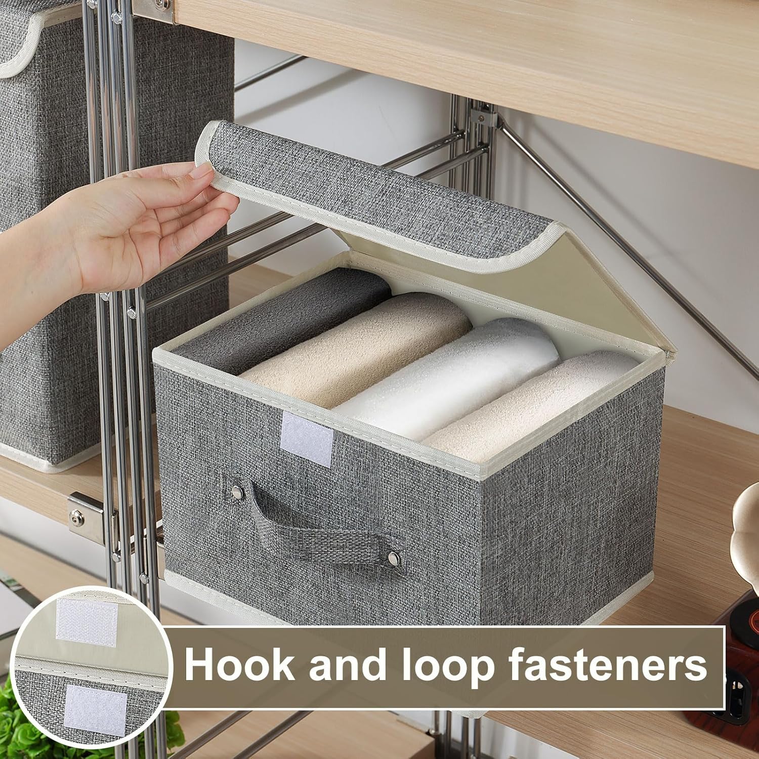 Storage Boxes, Collapsible Storage Bins with Lids, Cotton and linen cloth Storage Baskets with Handle, for Books, Closet, Bedroom, Home, 10.2x7.9x6.7 in, Grey