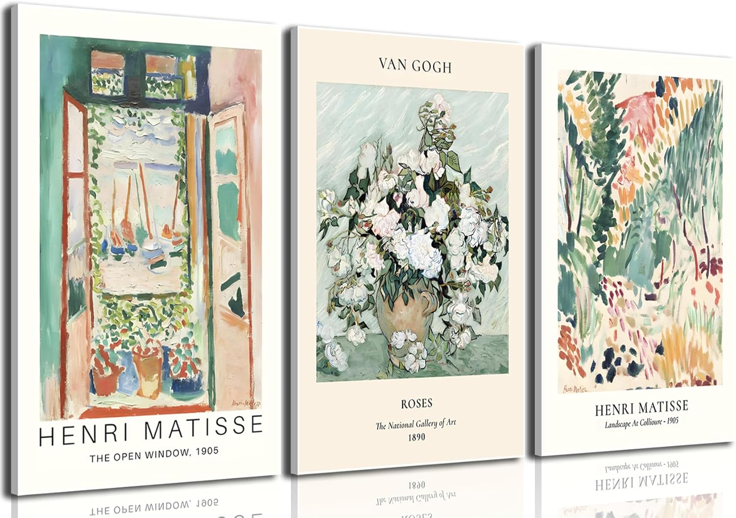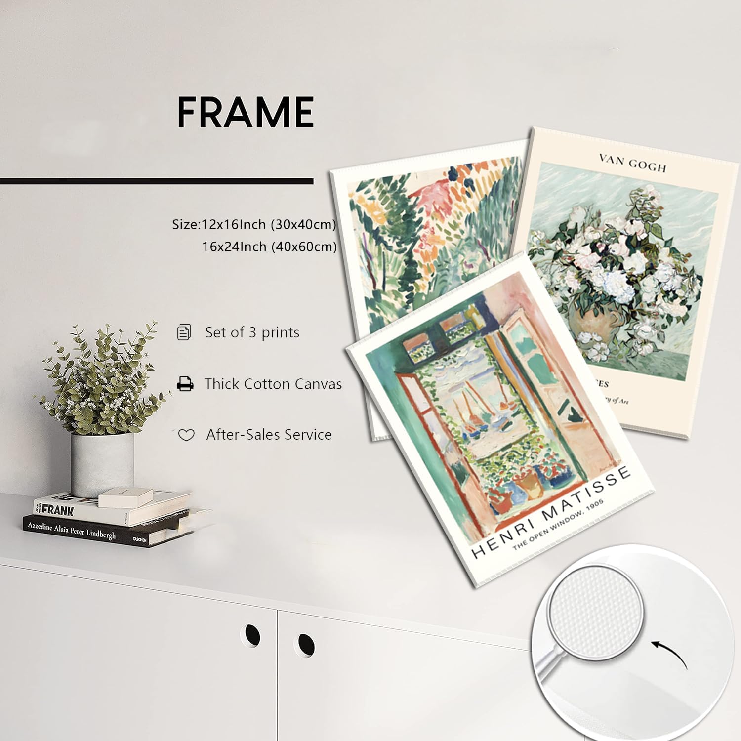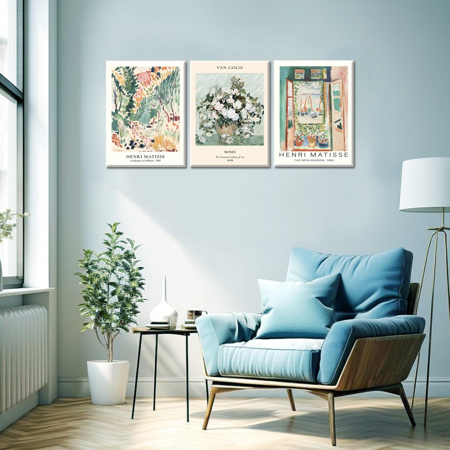 - Framed Matisse Wall Art–This vintage Matisse wall art is one of the most popular trends now. The beige poster for room aesthetic is ideal for aesthetic room decor. Featuring Matisse's "Landscape at Collioure", Van Gogh's "Roses", and Matisse's "The Open Window", Sage green botanical abstract canvas wall art prints ,Each canvas incorporates an abstract floral theme paired with soothing sage green and neutral tones.