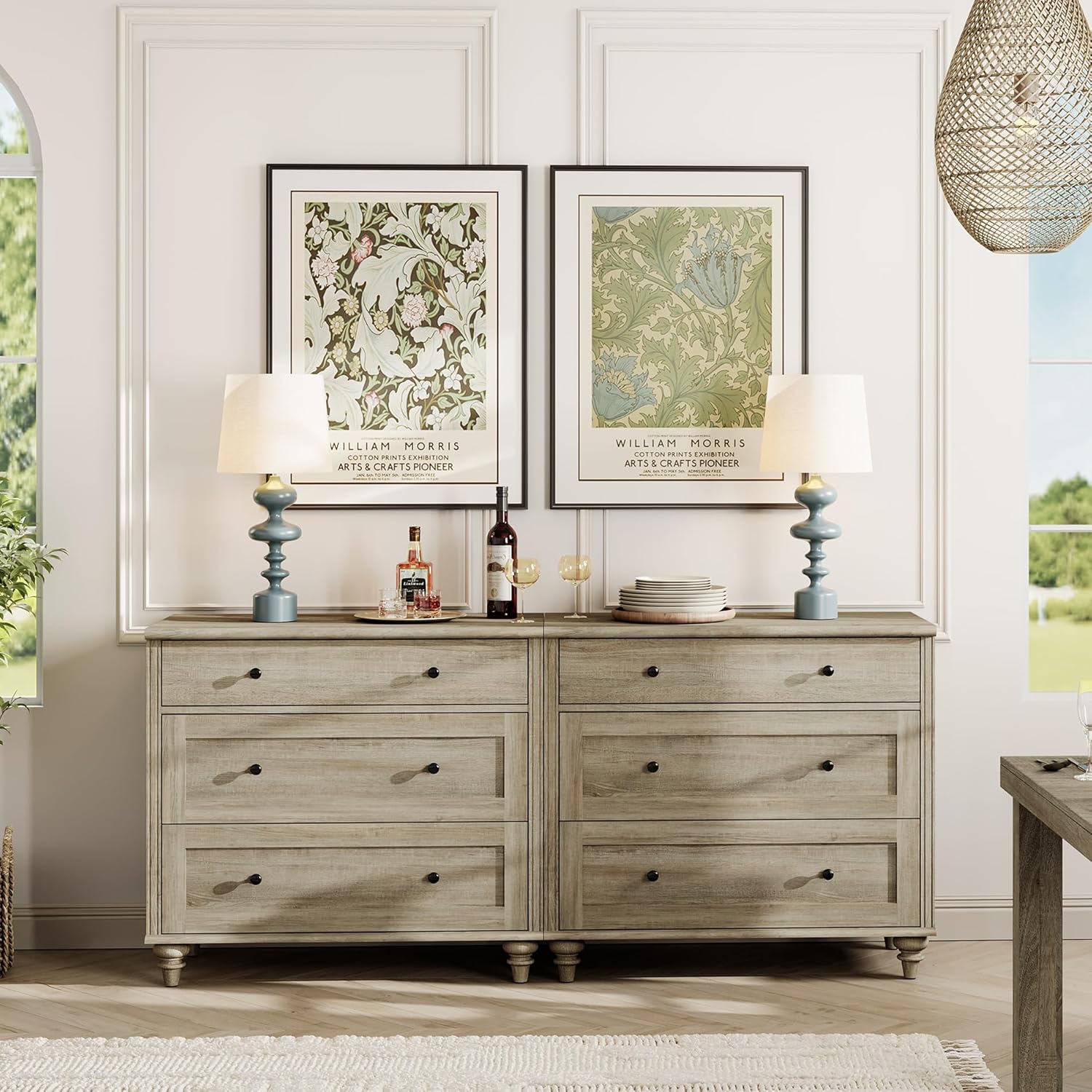 - ă2-in-1 Multipurpose DresserăThe 2-in-1 large dresser can be used together as 6 drawer dresser or tv stand for 75 inch tv, or used separately as two 3 drawer dressers.With distresser suface is very classic and elegant which blends in easily with any decor. It is ideal as a baby dresser, kids dresser and console table, etc.