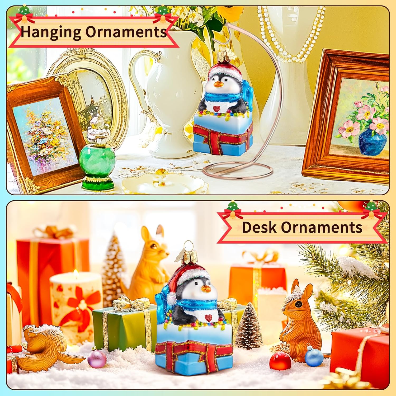 - Hand-Blown Glass: Glass christmas ornament originated from the traditional art of the 19th century, blowing molten glass into beautifully carved molds, and intricate details are hand-painted by skilled craftsmen. Each penguin is unique, making it a valuable and unique creative artwork