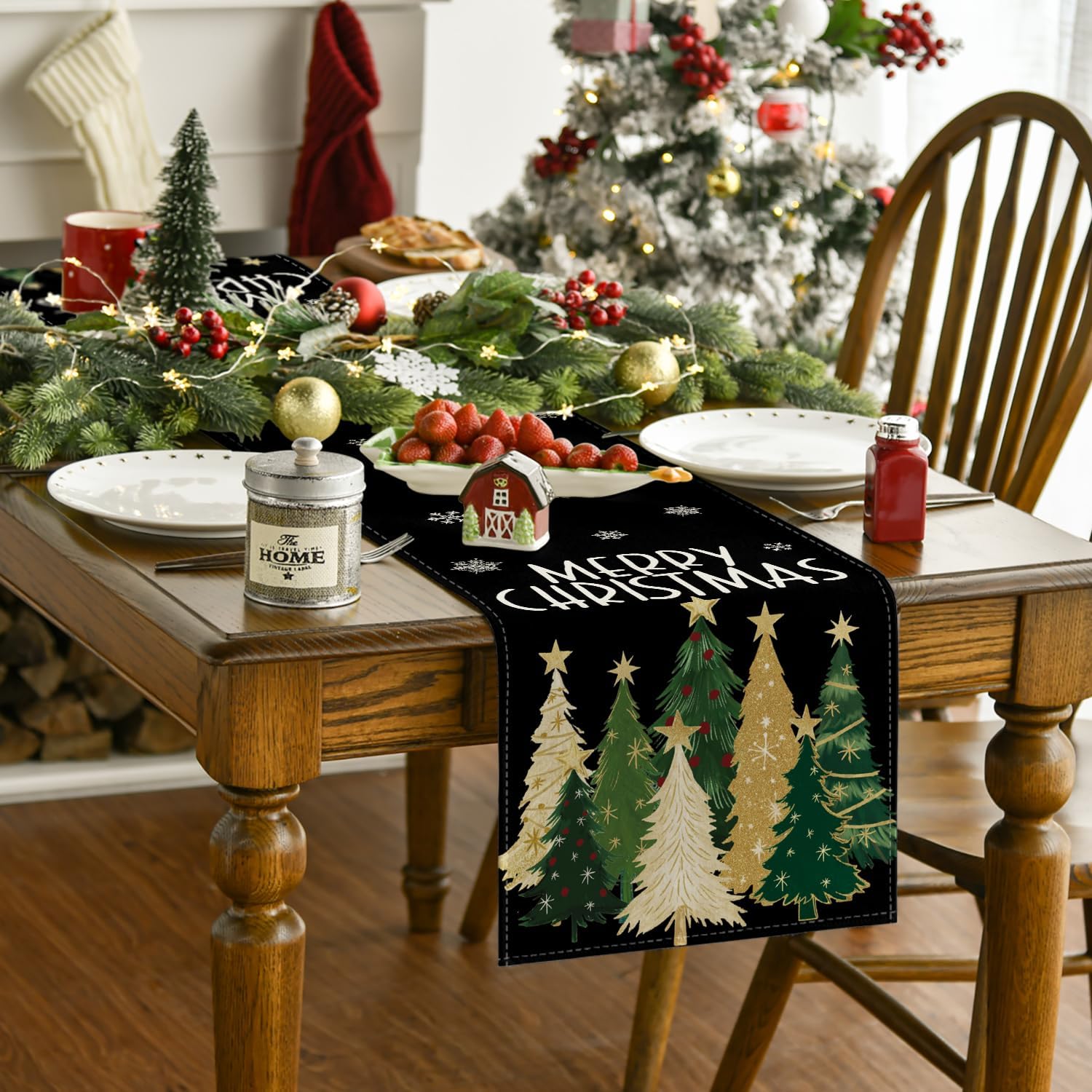 Artoid Mode Xmas Trees Snowflakes Black Merry Christmas Table Runner, Winter Seasonal Kitchen Dining Table Decoration for Home Party Decor 13x108 Inch