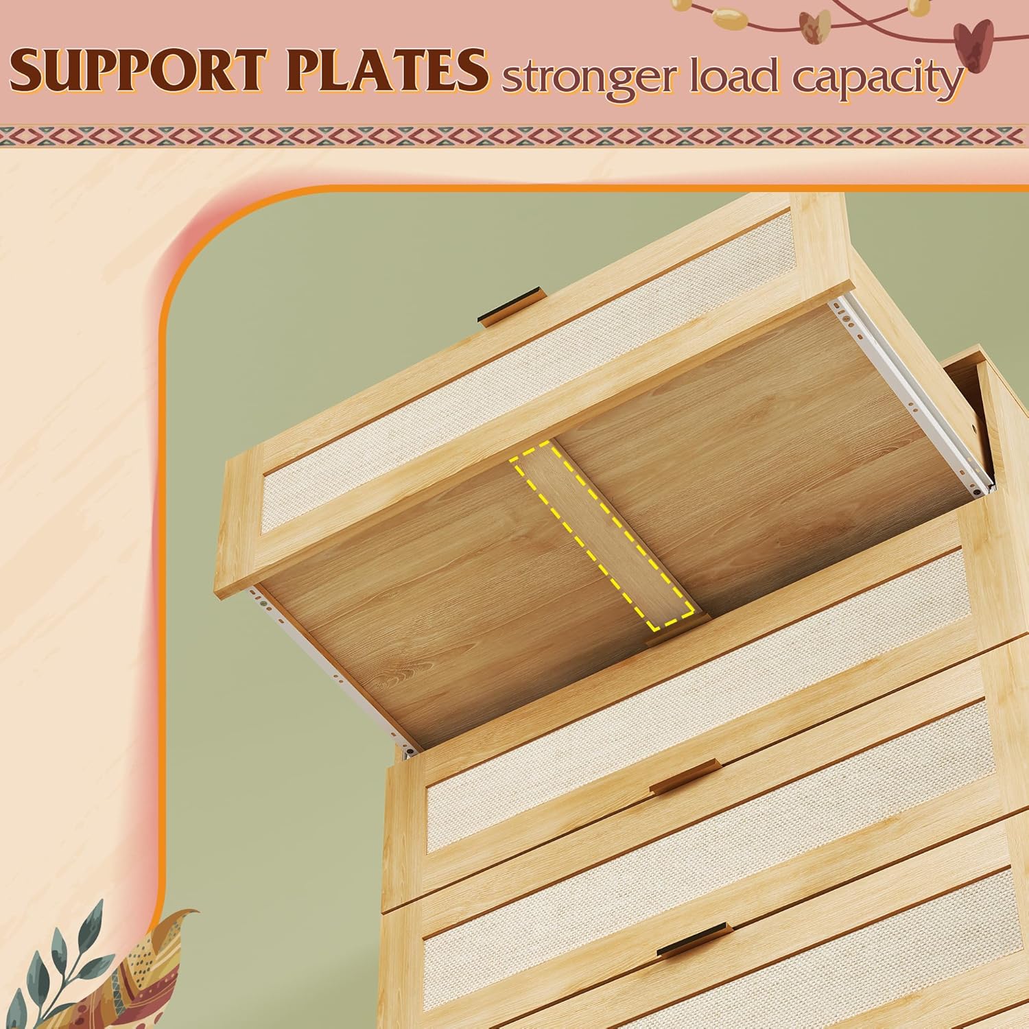 - 🎄【Boho 5 Drawers Dresser】This wooden dresser is made of light wood with wood texture and warm color. The surface of each drawer is decorated with a rattan texture, and the metal handle is smooth and durable. The boho dresser can be used for bedroom clothing organizer, entryway table, decorative storage for living room.