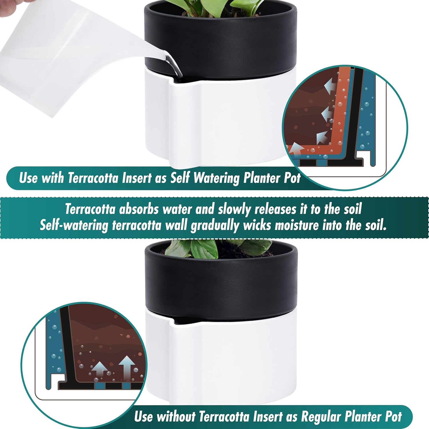 8 Inch Self-Watering Planter Pot with Terracotta Insert, Deep Water Reservoir, and Ceramic-Alike BPA-Free Plastic Planter Pot for Plant, Modern Planter for Houseplants, White/Black, 53-B-T-4