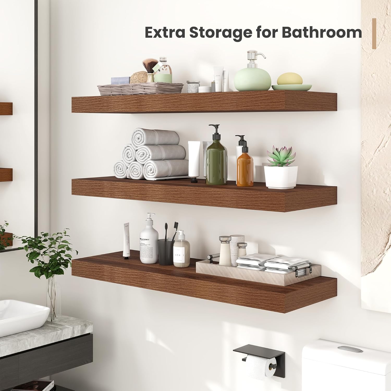 Heimlove 24 x 12 Inch Deep Floating Shelves Wall Mounted with Invisible Brackets,Storage Hanging Shelf for Wall Decor in Bathroom, Bedroom, Toilet, Kitchen, Living Room, Office Set of 2 (Walnut)