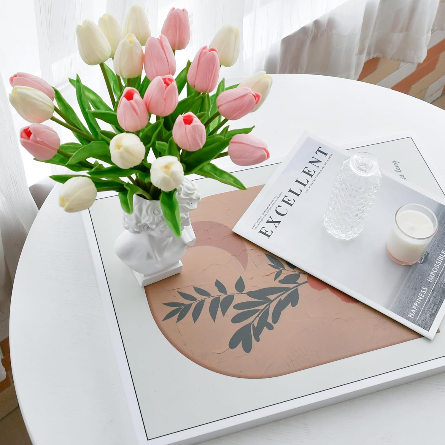 - All-Season Beauty with Gentle Color Care.These tulips bring timeless charm to Easter, Mother’s Day, weddings, or year-round décor. To preserve the soft tones of light-colored flowers—especially white—we recommend avoiding direct sunlight for long-term (6+ months) display, as PU petals may naturally yellow over time.