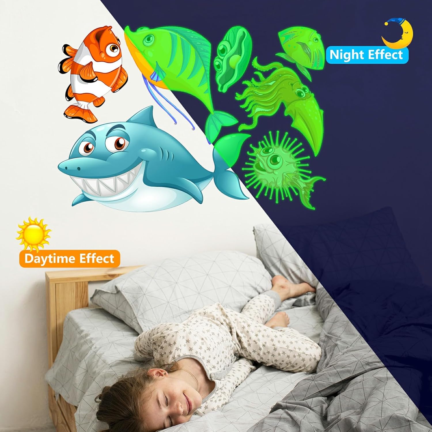 - ✦ Glow Under the Sea Wall Decals: These glow wall decals for ceiling are made of quality luminous material,they will glow brightly when absorb enough light during the day. You just need to put it under lamplight flashlight ,room light or sunshine for 15 minutes, it will keep glowing for 8-10 hours with a gentle green fluorescent light. Please ensure the light shines on the decals without obstruction, the longer it takes to absorb light, then to light up for up to longer.