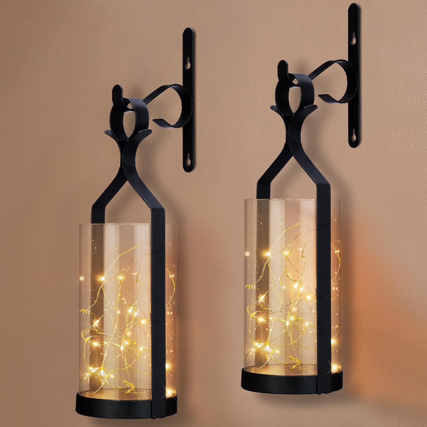 - Wall Sconce: Set of 2 black metal wall sconces with cylindrical glass shades and string lights. The vintage-inspired design features an elegant matte black iron frame (5''x5''x15'') perfect for adding classic charm to any room