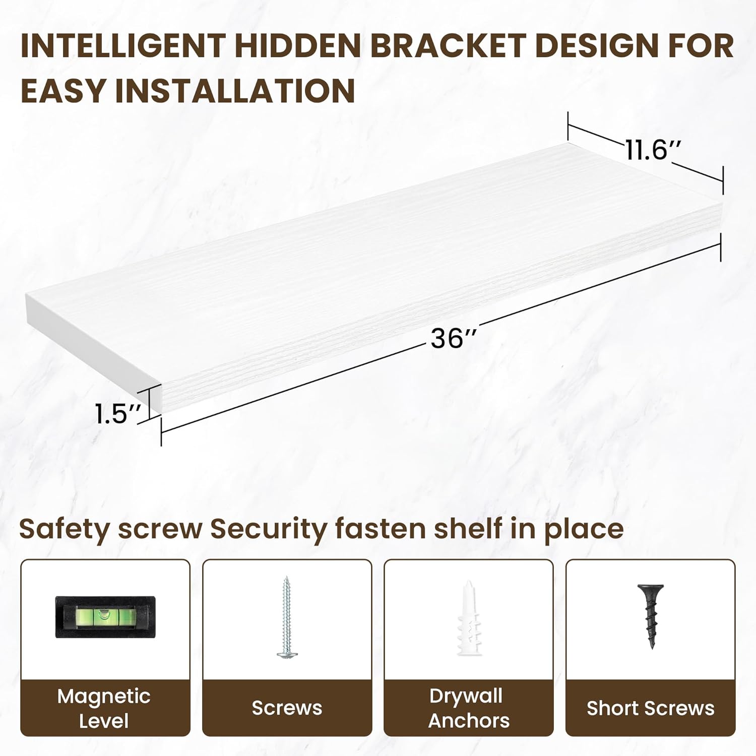 36 Inch Floating Shelves, 12 Inch Deep Floating Shelves for Wall, Floating Shelf with Invisible Brackets, Large Deep Wall Shelves for Bathroom, Bedroom, Living Room, 2 Pack, White