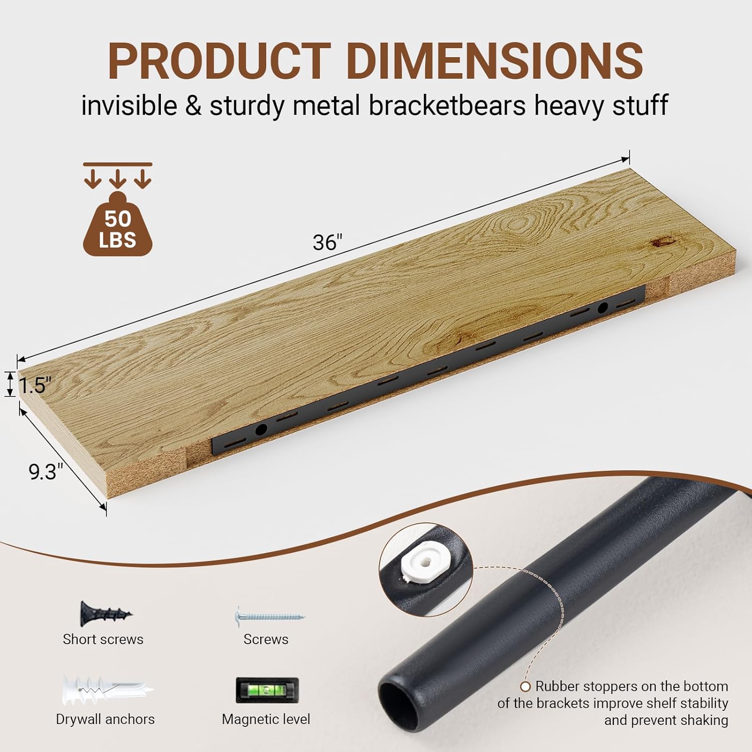 - ăLonger DesignăOur pretty 36 inch wall shelves are 36"W x 9.3"D x 1.5"H.Our floating shelves oak is longer than traditional designs and can hold more items.The 36 inch floating shelf optimize wall space,helping organize essentials without taking up floor space in your home.