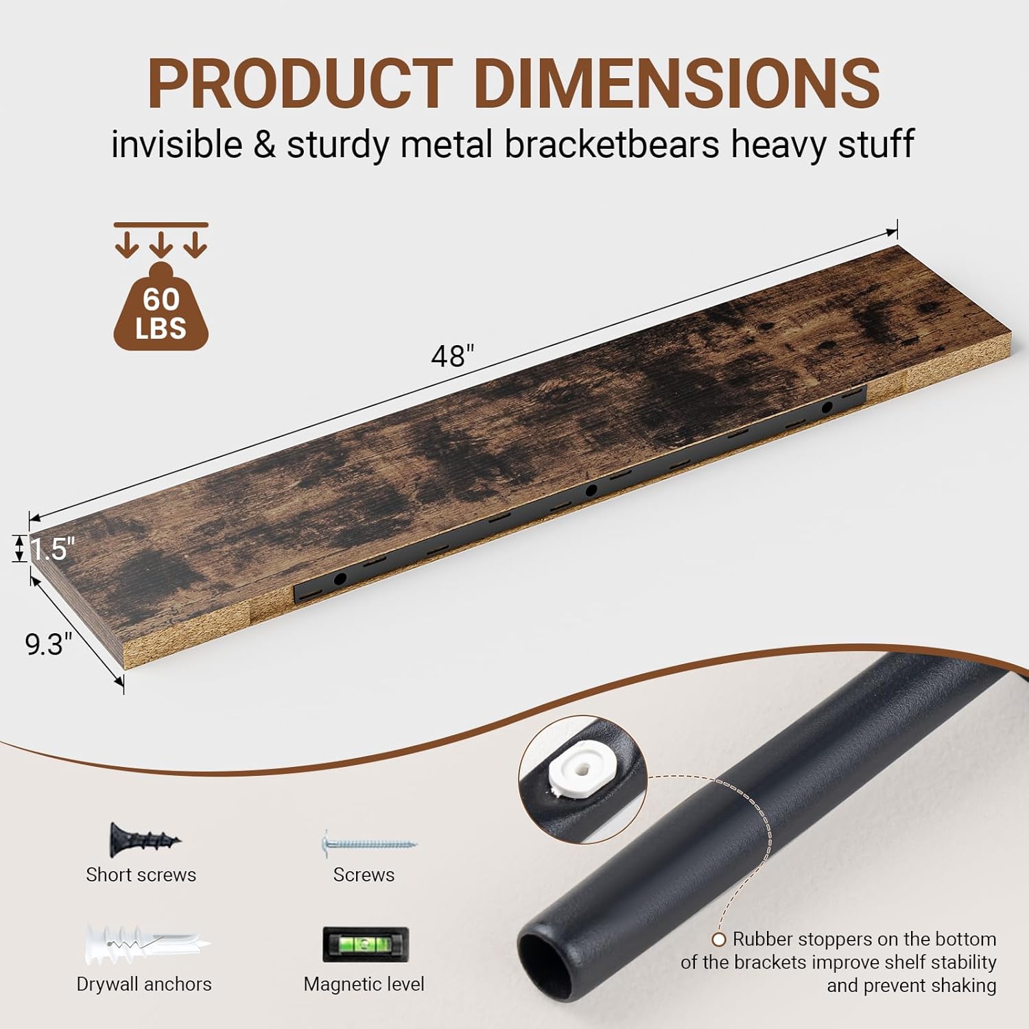 Floating Shelves for Wall 48 Inches Long,9.3" Deep Rustic Brown Floating Shelf Set of 2,Wall Mounted Wood Shelves for Bathroom Bedroom Living Room Kitchen Office,Shelf for Books Storage Room Decor
