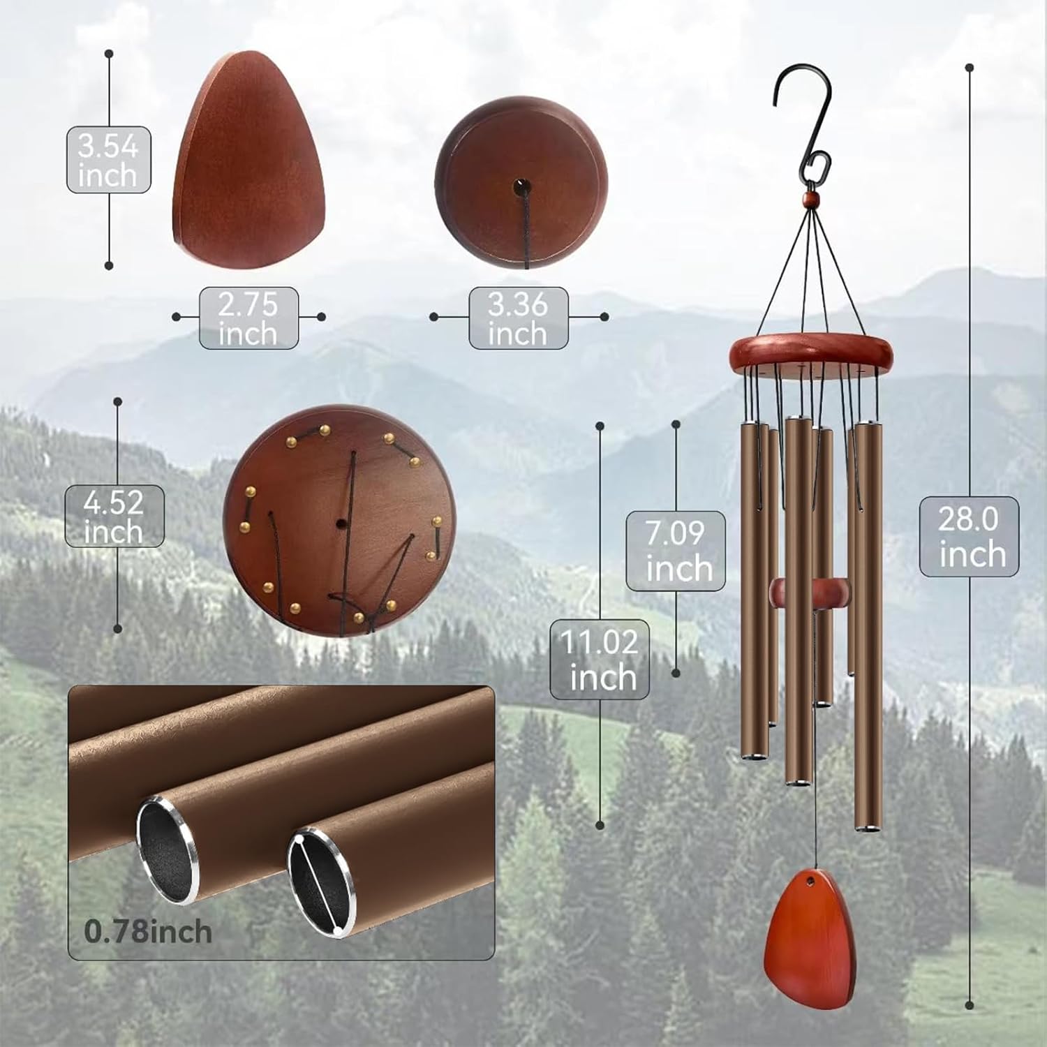 - ♬【Premium Material】Through repeated tests and experiments on a large number of materials, due to the characteristics of pine wood is not easy to crack and decay, we chose pine wood as our wood material. The main body of the wind chime is made of aluminum tubes and chamfered with spray paint, which is rust-proof and sturdy, making the life of the wind chime much longer and more beautiful and durable at the same time.