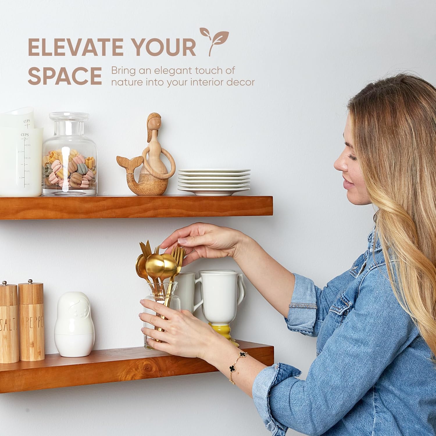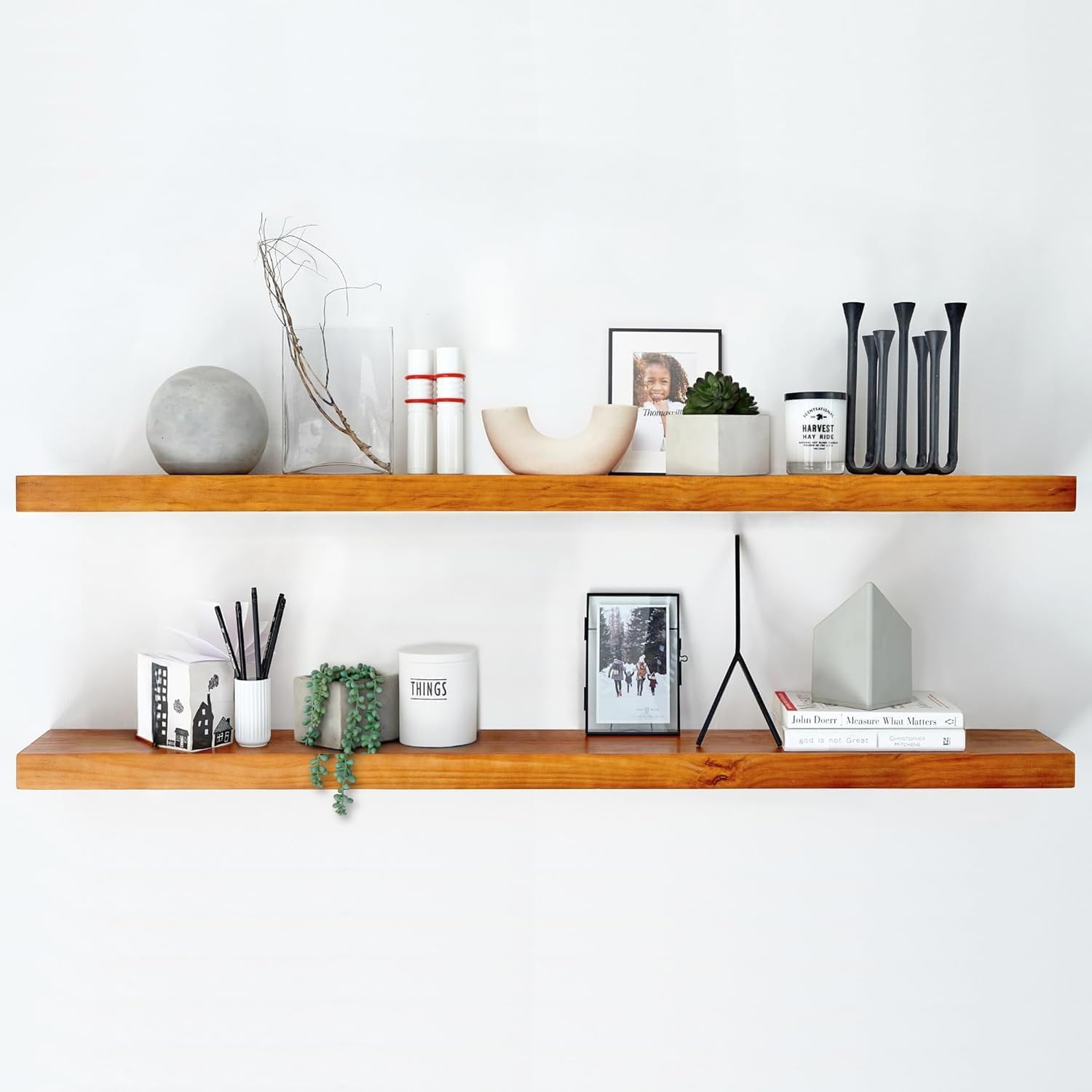• AUTHENTIC WOOD GRAIN - Enjoy the timeless elegance of real wood. Handcrafted from the finest 1.75" Thick natural pine wood measuring 60" Wide x 6.5" Deep x 1.75". Our shelves highlight the inherent charm and durability of high-quality wood. Each Shelf reveals its unique character of knots and natural wood grain; each ledge is a little different but equally stunning.