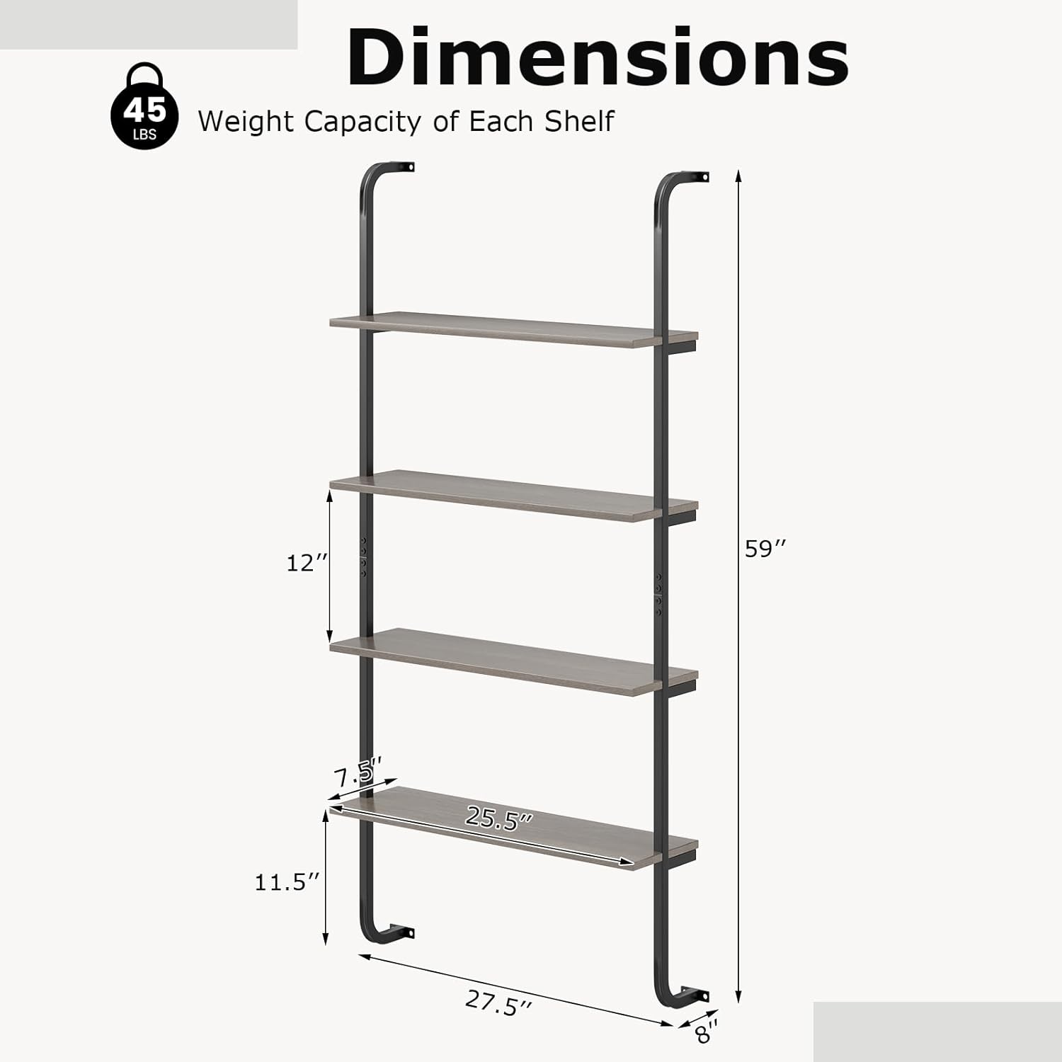 Giantex 4-Tier Industrial Bookshelf of 2, Wall Mounted Pipe Shelving Unit, Floating Shelves with Metal Frame, Hanging Wall Display Shelf, Wood Ladder Bookshelf for Living Room, Kitchen,Gray Oak