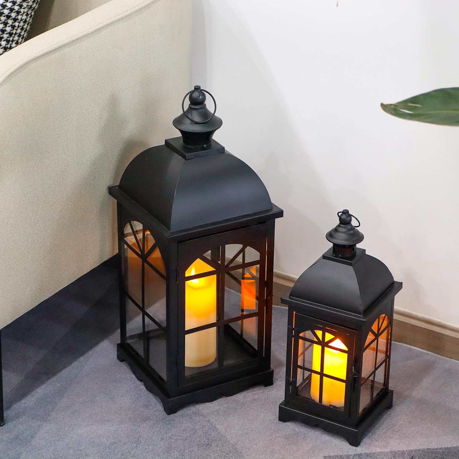 TRIROCKS Set of 2 Decorative Vintage Candle Lanterns 14.5"&20" H Farmhouse Outdoor Hanging Lanterns with Tempered Glass for Porch, Balcony, Patio, Home, Centerpieces, Indoor, Outdoor(Black)