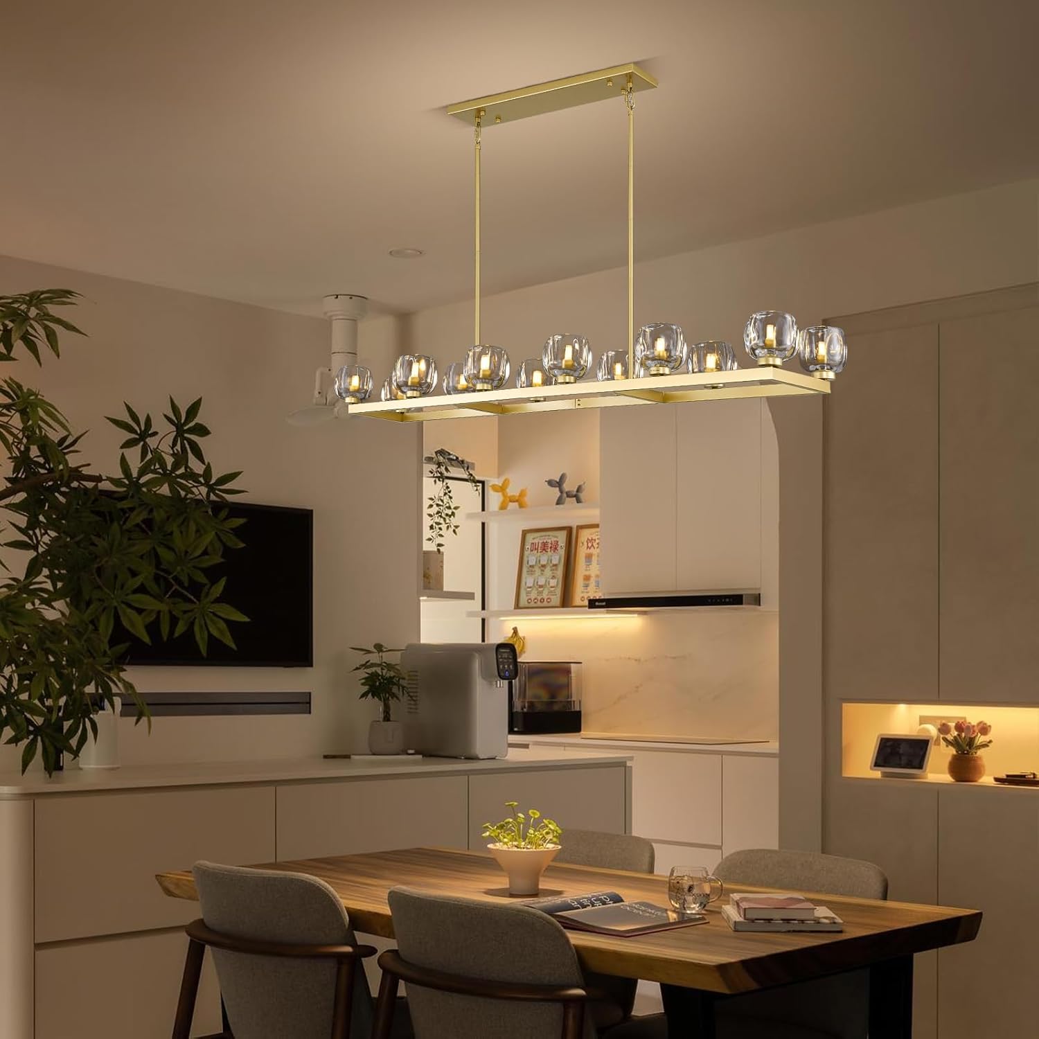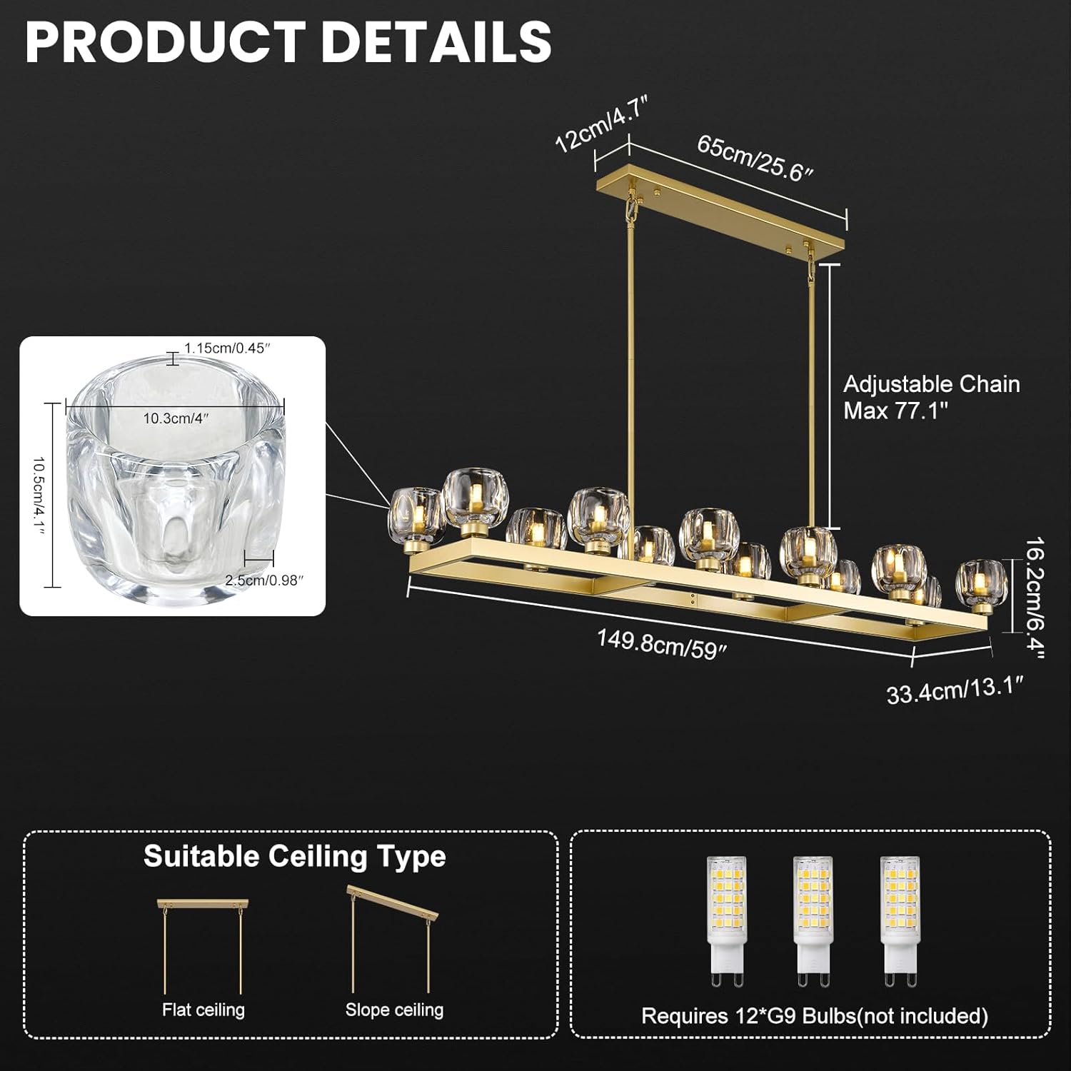 - 【12-Light Chandelier】Gold rectangle chandelier offers 360° light coverage to brighten your space & create a cozy vibe. The linear chandelier for dining room requires 12 G9 bulbs and available for infinite dimming via a dimmer. (Dimmable bulbs & dimmer not included).