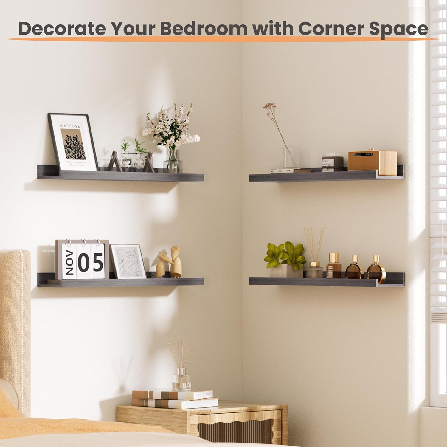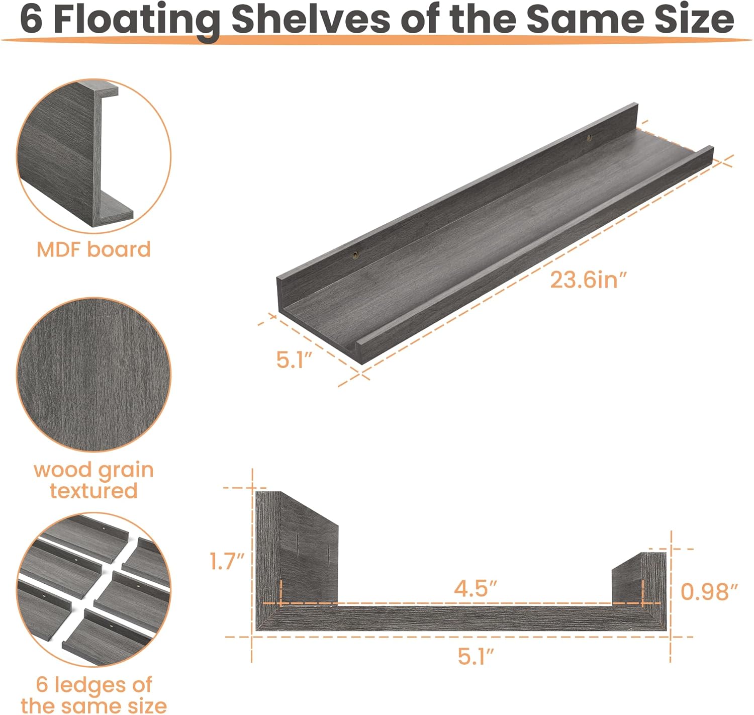 upsimples Floating Shelves for Wall, Wood Mounted Shelf Decor Storage Set of 6, for Bedroom, Living Room, Bathroom, Kitchen, 23.6 inch Long Picture Ledge, Grey