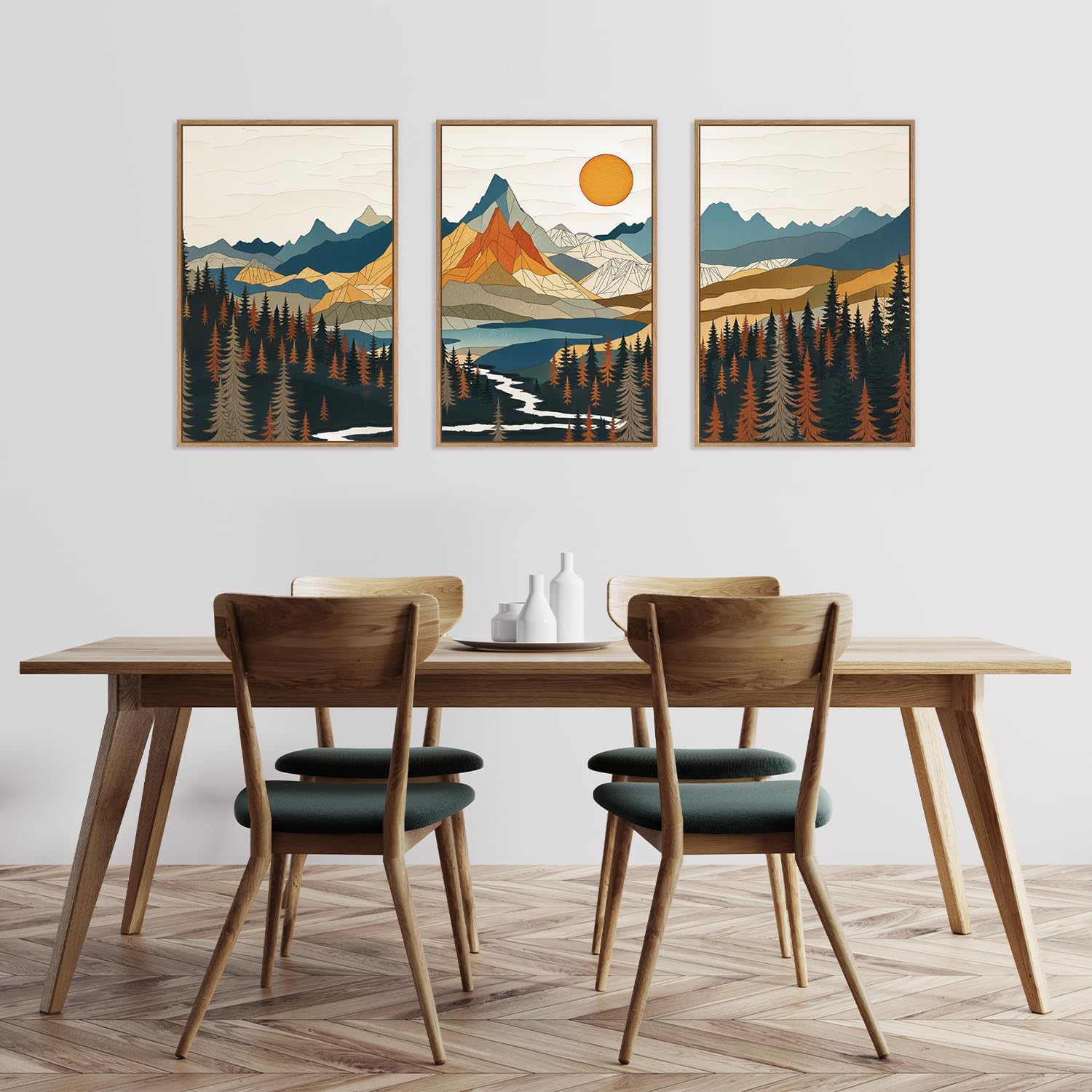 HLNIUC Large Sunset Mountain Framed Wall Art,Boho Forest Pine Tree Canvas Wall Decor Set of 3(16”X24”) Blue and Orange Landscape Art Print,Colorful Mountain Lake Wall Painting for Living Room,Bedroom