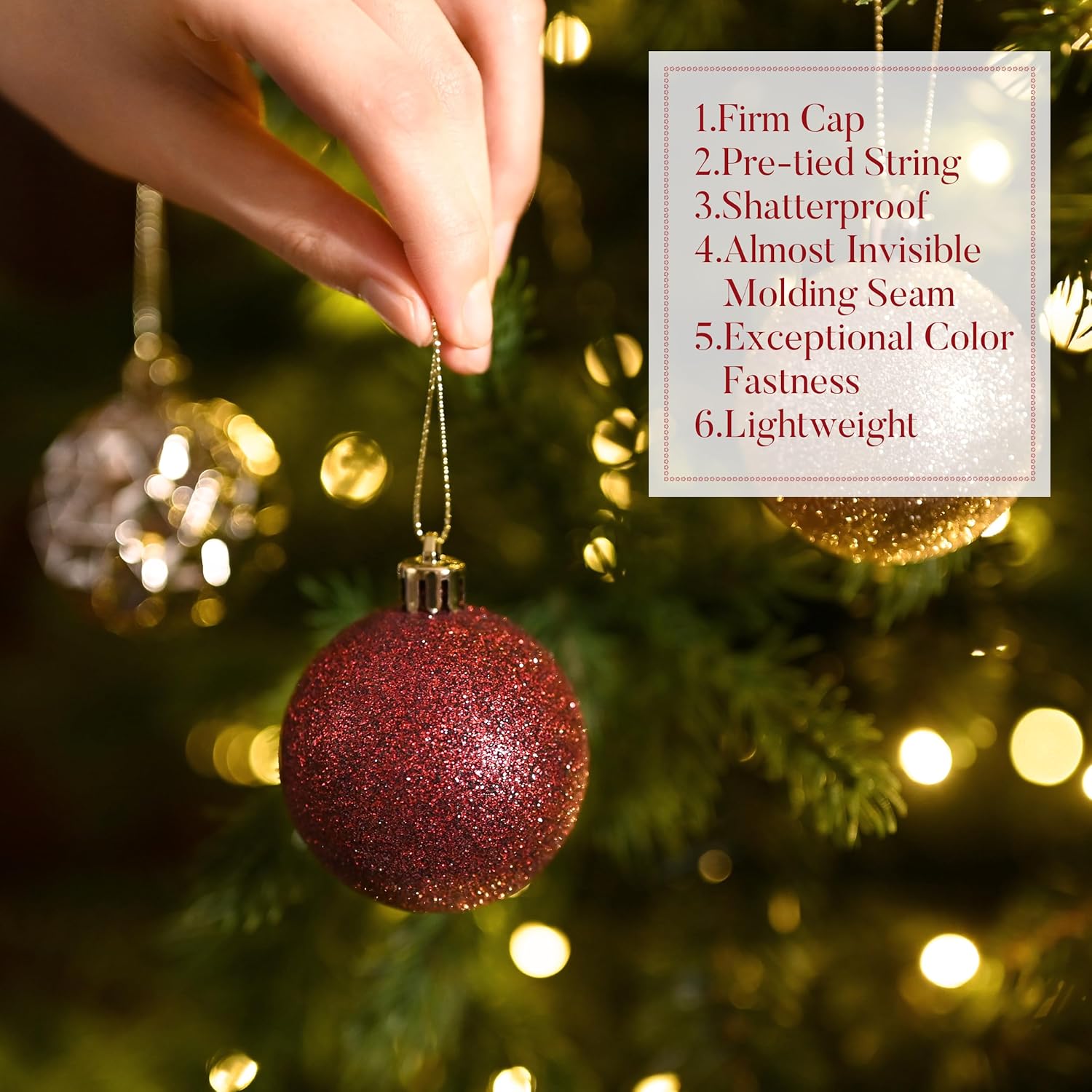 • 【Shatterproof】These Christmas ornament are made of sufficient thickness plastic to prevent breakage. The ornament set remains intact even after falling from 2 meters high onto a hard floor. It is suitable for family