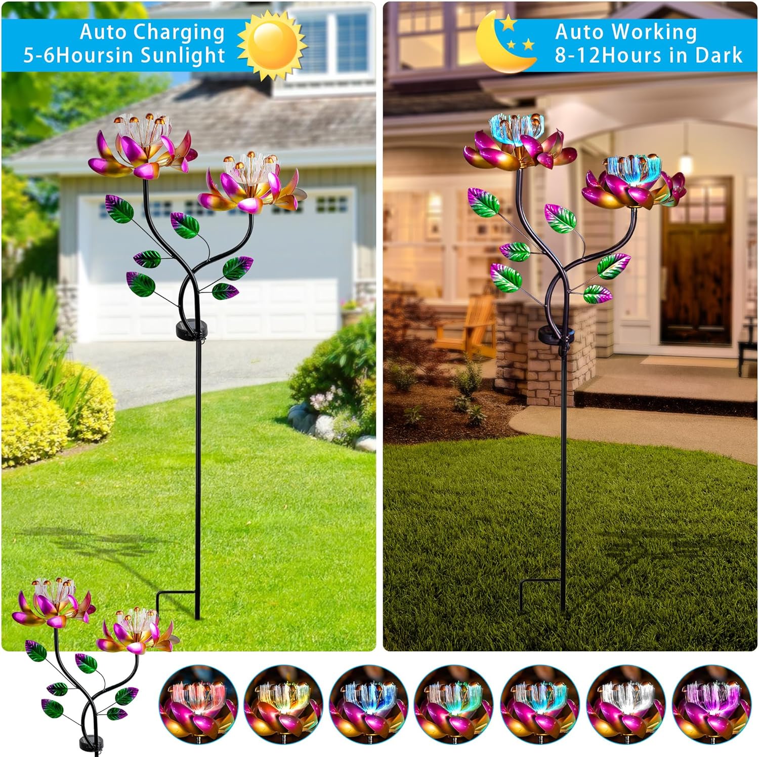 55'' Solar Powered Kinetic Wind Spinner Sculpture Pink Lotus Metal Stake Spinner for Patio, Lawn and Garden Decor Weather-Resistant Outdoor Art with Dual Lotus Design