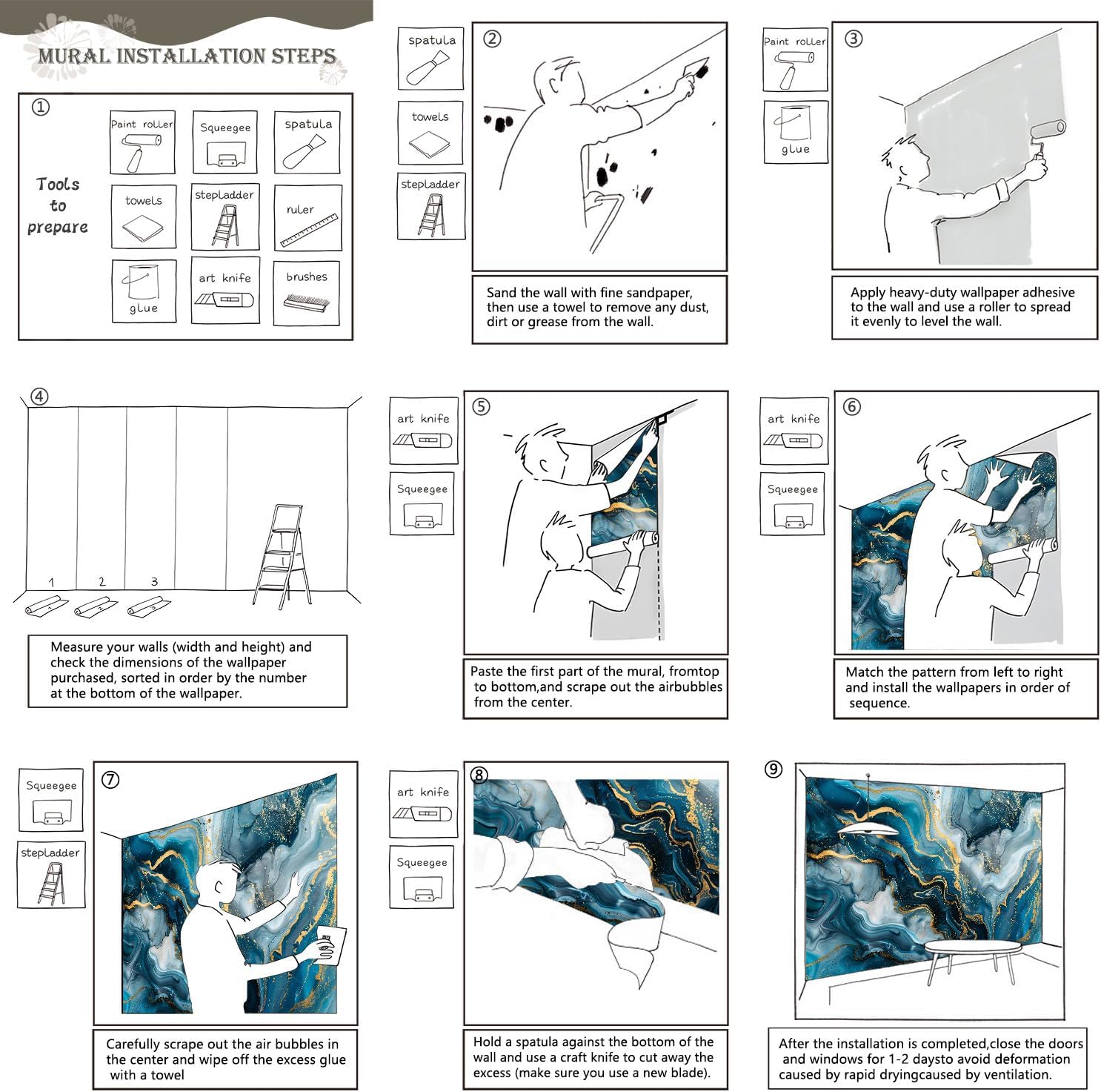 - Tips: Mural can not be peeled and pasted, you need to buy a heavy duty wallpaper glue