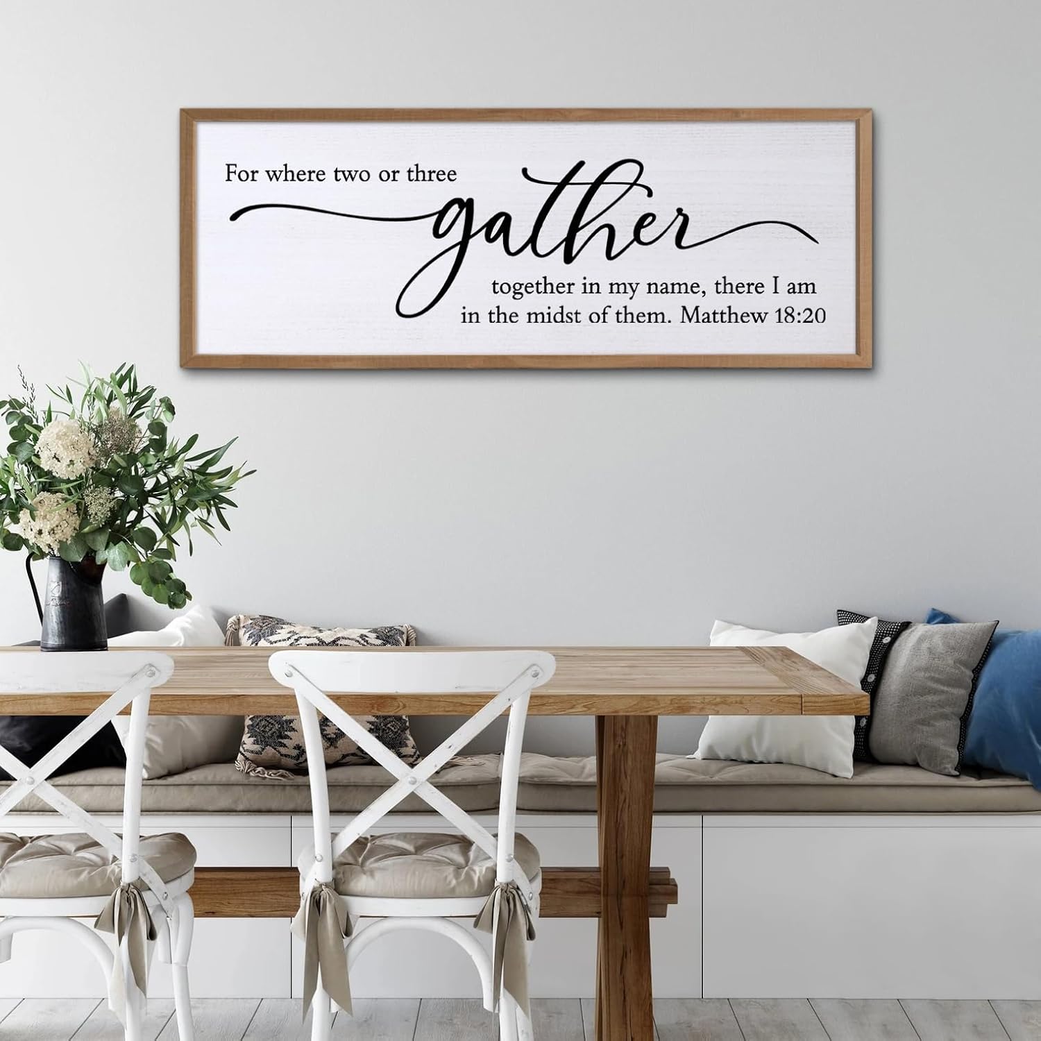 For Where Two Or Three Gather Sign Dining Room kitchen Wall Decor Bible Verse Scripture Matthew 18:20 Wooden Frame 32X12 Inch for Christian Family Hanging Art (Wood)