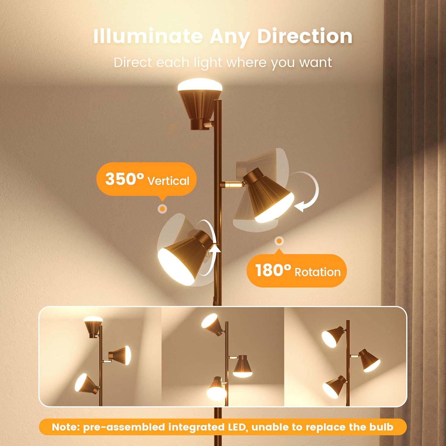 - 【Dimmable Floor Lamp & Individual Switch】Our modern floor lamp is equipped with LED light, 36W (equal to 200W incandescent), which is up to 3000 lumens, no need to install extra light bulbs, allows you to dimmable from 10% to 100% brightness, while there are 4 color temperatures changing to provide warmer and brighter light. Plus, each light can be turned on or off individually, you can turn on all the lights for bright lighting or turn off 1-2 lights for reading or bedtime