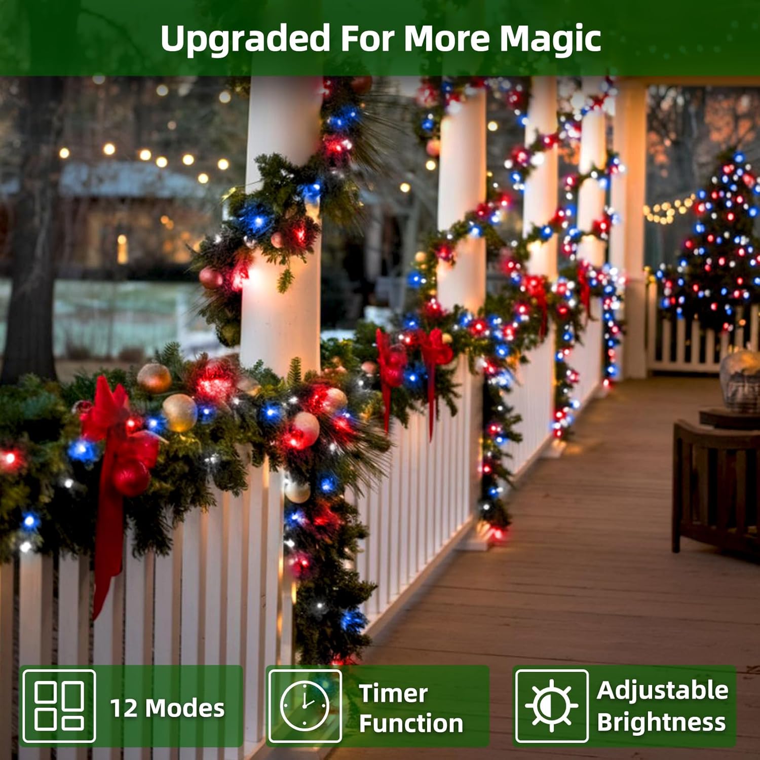 - Perfect for Large Homes: Tired of connecting multiple strands? This 240ft 750 LED Red, Blue and Cool White outdoor Christmas string lights on dark green wire is long enough to wrap your garage, windows, roofline, porches, and even 15–20ft Christmas trees. One seamless strand delivers a bold, dynamic glow, blending festive warmth with cool brilliance to make your home unforgettable this holiday season.