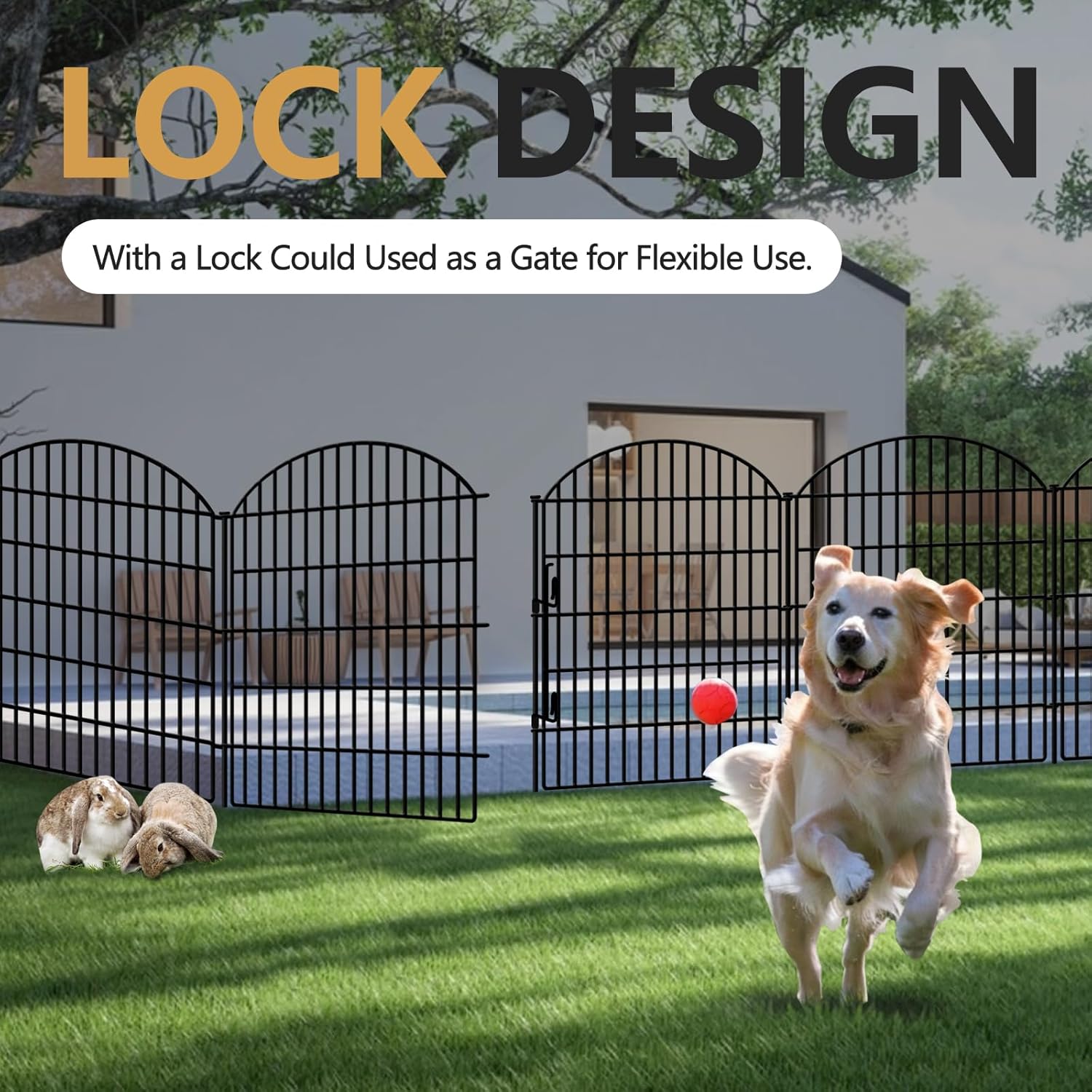 • MORE AVAILABLE SIZE: The classic arch shape design garden fence single piece measures 26.77" wide, 33" high, 1.5" gap. Comes with 16 metal stakes are 44" in height, which can be inserted into about 12.6 inches above the ground, making it strong enough to prevent animals from entering & leaving, dog digging, and even keep rabbits away from your plants. A total of 15 fence panels with a lock, connecting 16 fence stakes, the total length of the garden fence is approximately 32.87 ft.