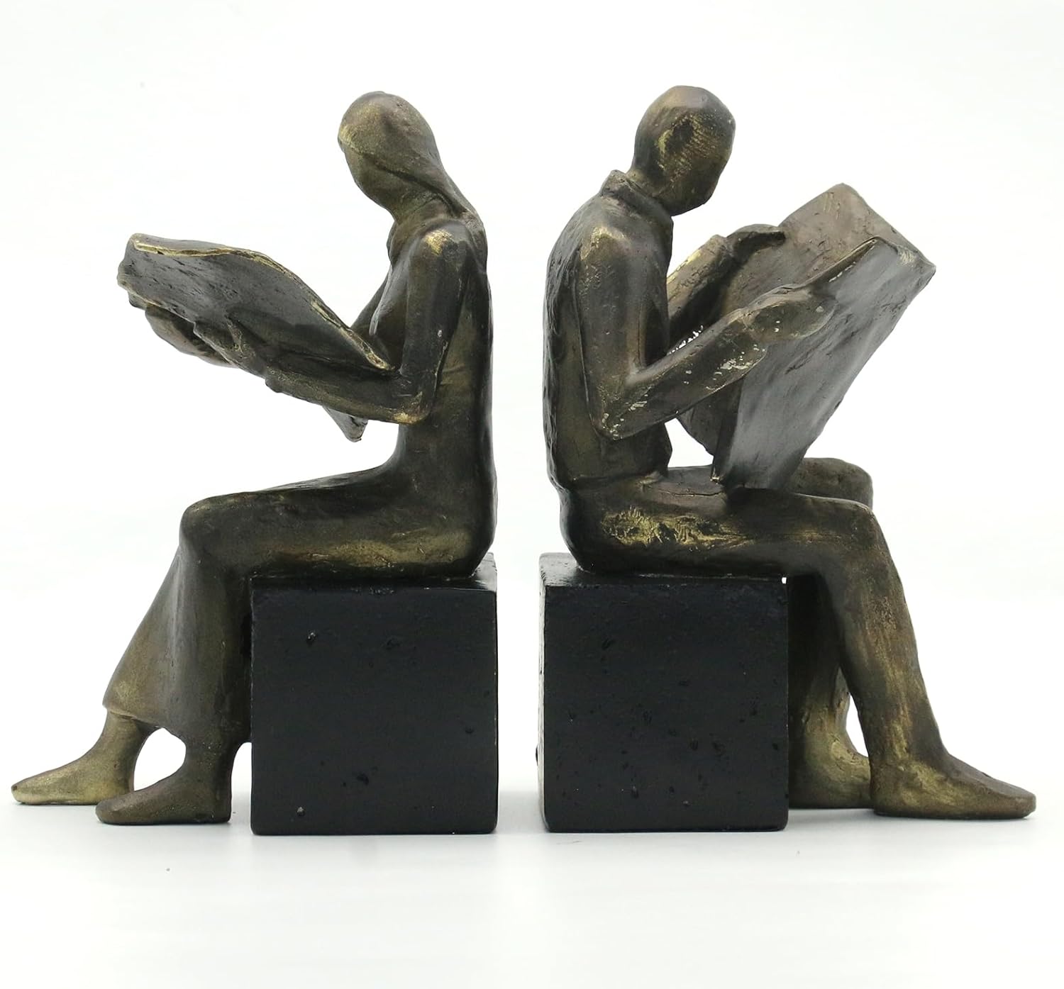 - 【Elegant Reading Couple Bookends】: These bookends feature a sophisticated couple reading newspapers, cast in a rich bronze finish. The classic design adds literary charm to any bookshelf while providing sturdy support for your book collection