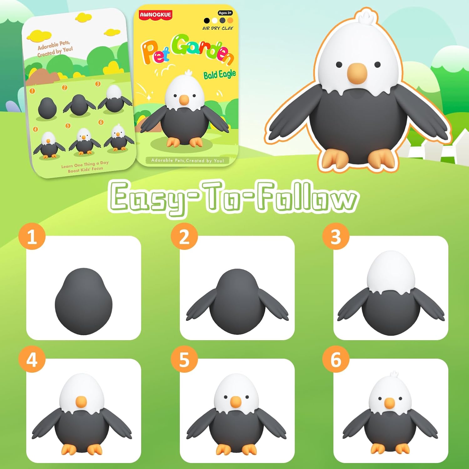- 【modeling clay for kids】:This air dry clay kit includes 12 individually wrapped boxes of 4-color clay and 5 sculpting tools. Each box of clay has a simple 6-step tutorial on the back to squish into a cute animal pet (bald eagle, American bison, red fox, grey wolf, panda ). This magic model clay allows kids to create a colorful pet garden, having endless fun!