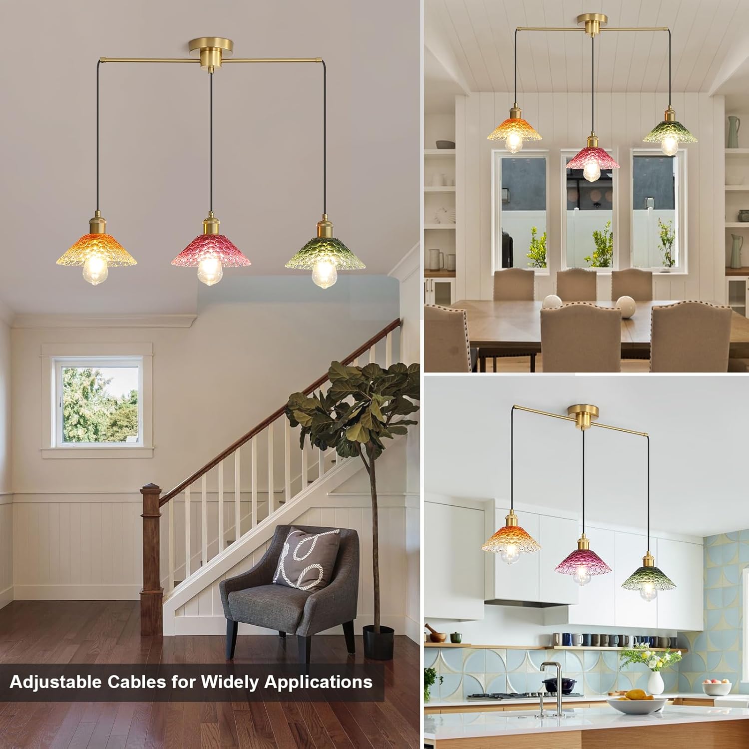 3-Light Pendant Lights Kitchen Island, Ceiling Hanging Lighting Fixtures, Colorful Vintage Glass Shade Pendants, Modern Gold Dining Room Chandeliers Height Adjustable for Farmhouse Living Room