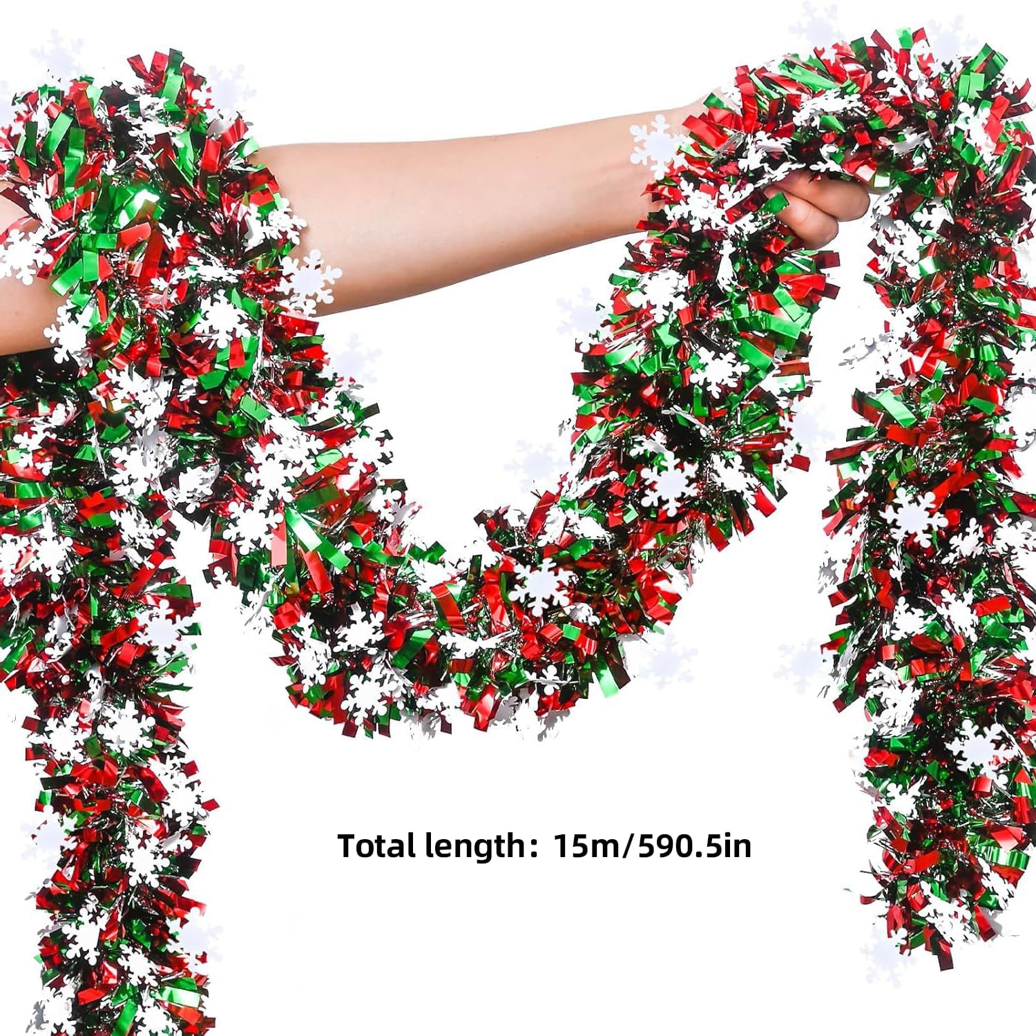 50 Feet Green Red Christmas Metallic Tinsel Twist Hanging Garland with Snowflake for Home Mantle Xmas Tree Staircase Railing New Year Holiday Party Indoor Outdoor Decorations