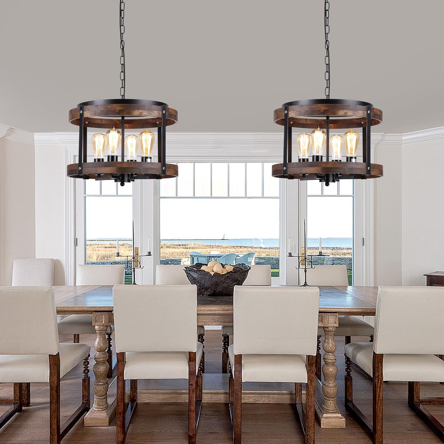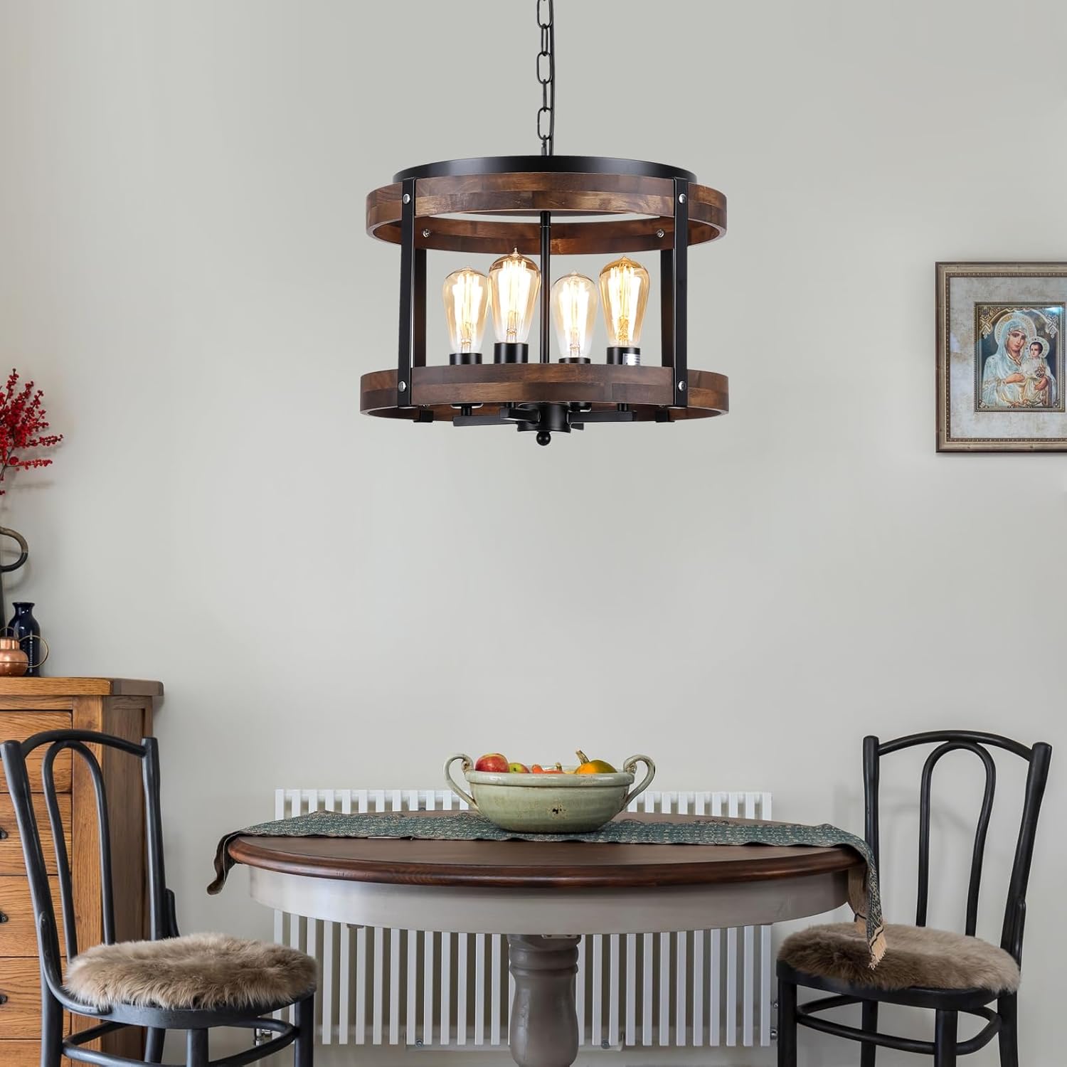 4-Light Large Rustic Farmhouse Wood Pendant Light Fixture with Adjustable Chain, 16.5 inch Oak Wood Drum Chandelier for Dining Room Kitchen Island Farmhouse Living Room Hallway, Black