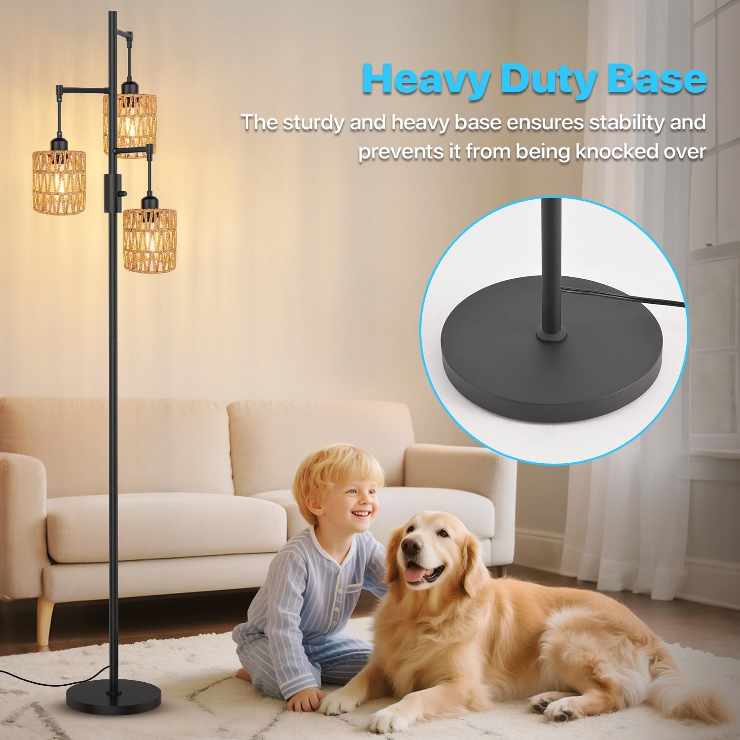 3-Light Boho Floor Lamp for Living Room, Rattan Wicker Standing Lamp Palm Tree Design, Farmhouse Coastal Floor Light with Woven Shade, Tall Bohemian Lamp