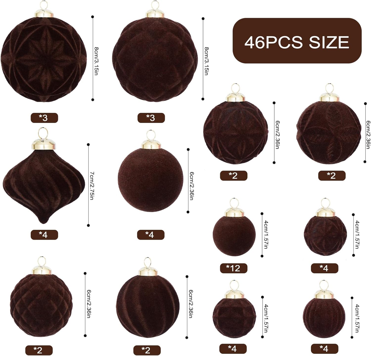46PCS Velvet Christmas Ball Ornaments Set, Flocked Shatterproof Xmas Tree Decor, Assorted Hanging Ornaments with Loop for Holiday Home Decor, Christmas Tree, Mantel, Party Decoration (Brown)