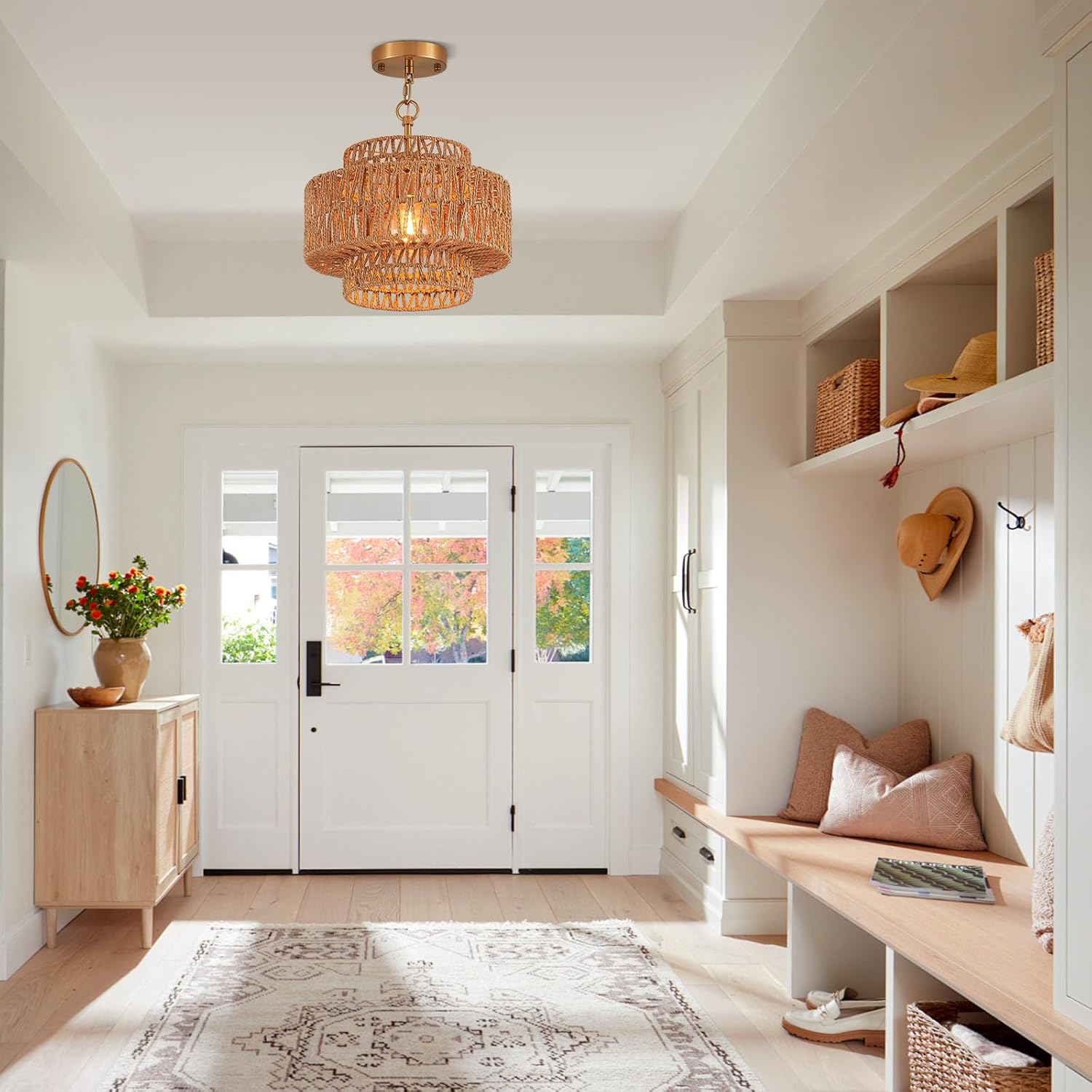 - 【Mini 3-Rier Design】The 3-tier rattan chandelier's simple wicker weave and gold finish metal frames bring a vintage bohemian style. This boho chandelier fixture features three round metal frames that form a captivating semicircular hollow cage. This design sets it apart, adding an element of sophistication.