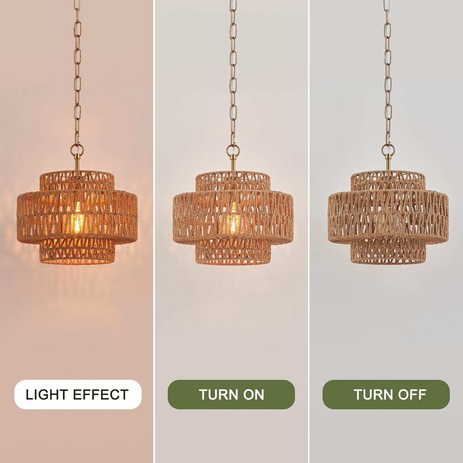 - 【Mini Size】The boho wicker gold pendant lighting with a 12.6" diameter and 8.7" height. Hanging chain can be adjusted, max 48", allowing you to achieve the perfect lighting arrangement for your needs.