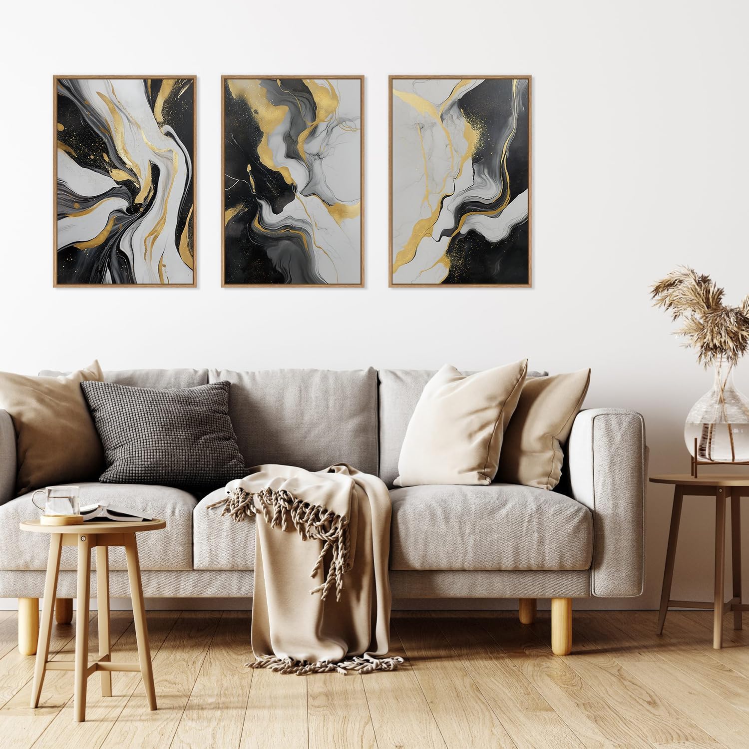 - 【Gold and Black Wall Art】Elevate the atmosphere of your home with the HLNIUC gold and black decorative paintings, featuring dynamic swirls of black, white, and gold, these artworks mimic the luxurious flow of natural marble. The fluid lines and glittering gold accents create a sense of movement, perfect for lovers of contemporary and minimalist aesthetics.Each print is expertly framed and ready to hang, making it a focal point in any room.