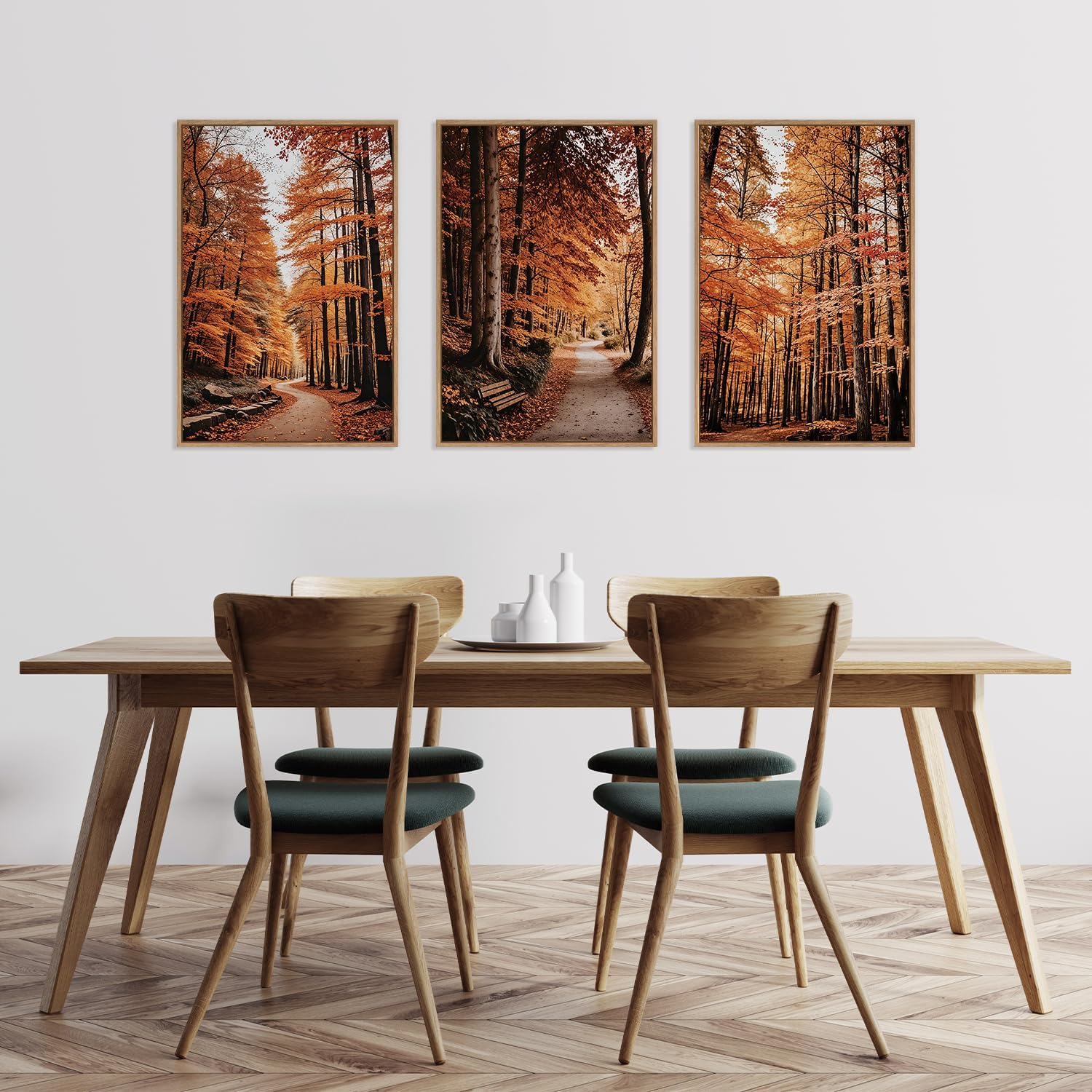 - Autumn Forest Wall Art: Elevate the atmosphere of your home with the HLNIUC autumn forest decorative paintings. These golden and red trees are symbols of autumn, visually like a real forest, you will imagine when you walk this romantic and peaceful path in the afternoon. This will fill your home with autumn.Each print is expertly framed and ready to hang, making it a focal point in any room.