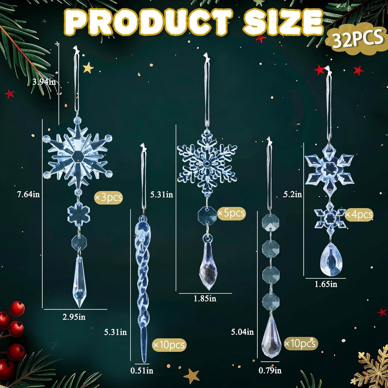- Package: You will receive a great value pack of 32 pieces blue acrylic Christmas ornaments set in 5 styles, including 12pcs unique designed snowflakes ornaments (5.2", 5.3" and 7.64"), 10pcs 5.3" crystal icicles ornaments and 10pcs 5" bead garlands