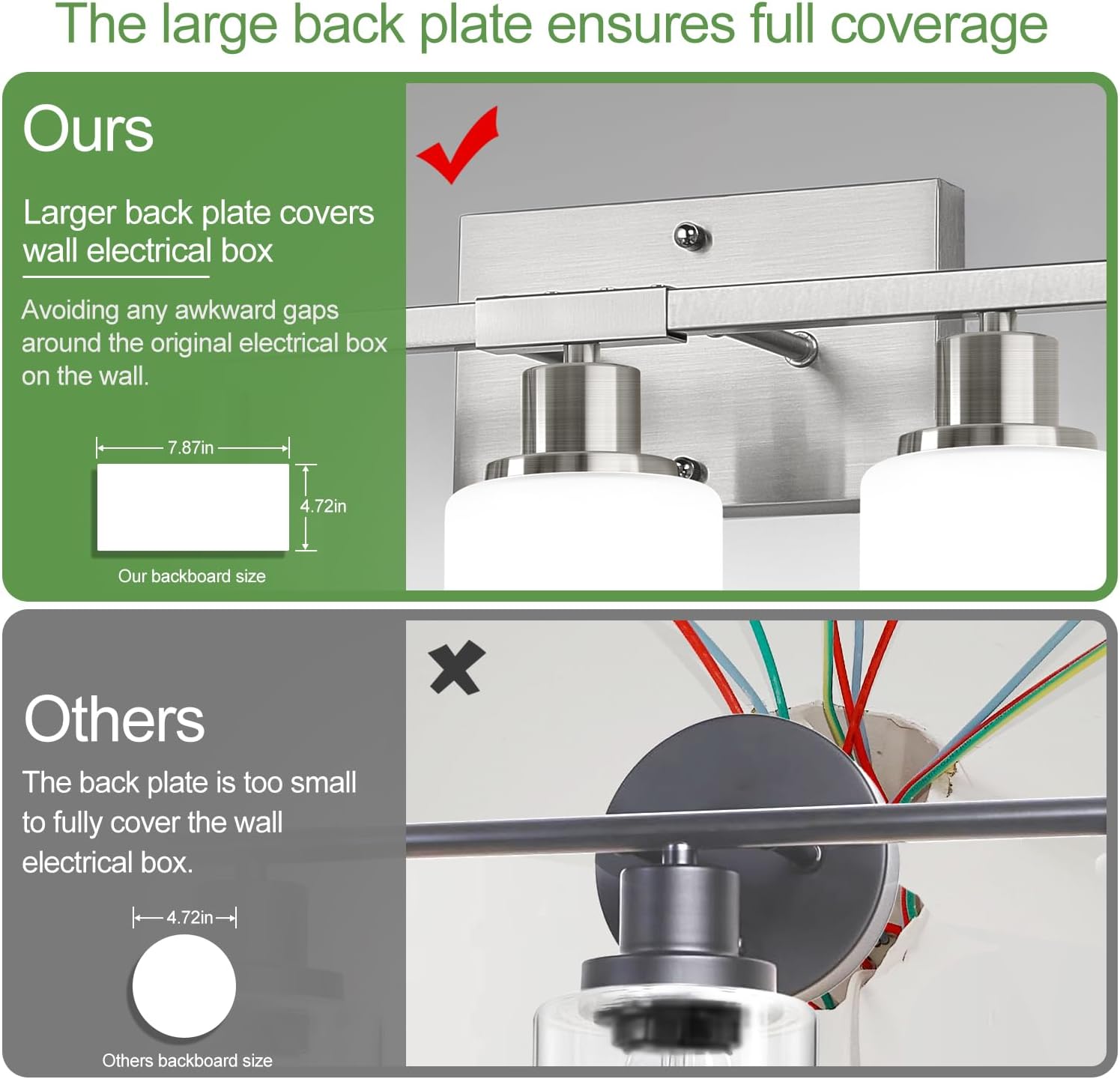 - Elegant Brushed Nickel Finish: Crafted with a sleek brushed nickel frame and protective coating, this bathroom vanity light resists scratches, tarnish, and fingerprints. It keeps its shine while adding a touch of modern sophistication to any space.
