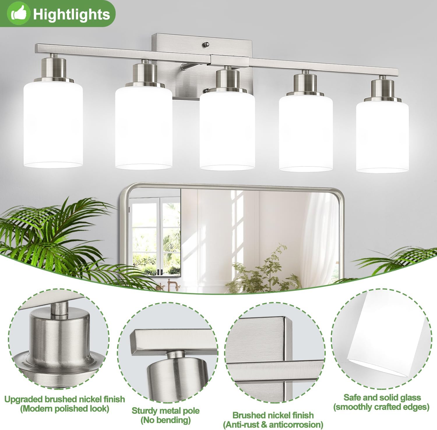 5-Light Brushed Nickel Bathroom Vanity Light with Milky White Frosted Glass Shades, Modern Bathroom Light Fixtures, Up/Down Reversible Lighting for Mirror, Bedroom, Kitchen, Living Room, Hallway