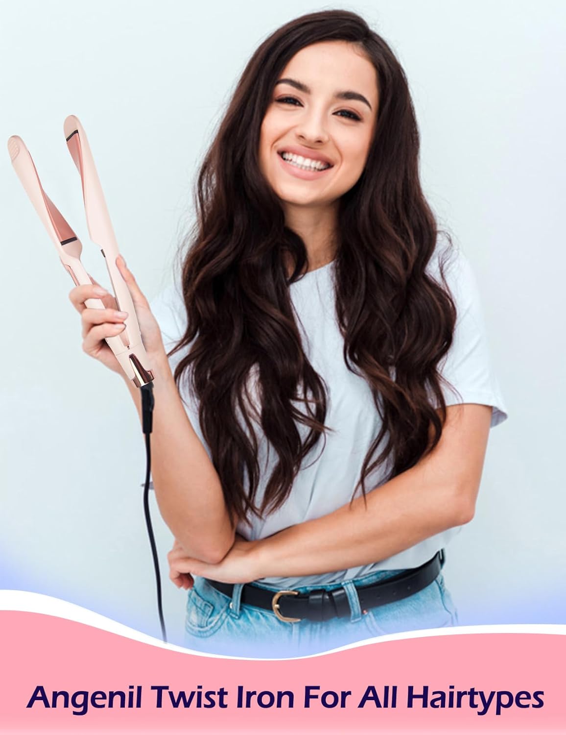 ANGENIL Pro Twist Flat Iron Hair Straightener, 2 in 1 Straightener and Curling Iron for Women, Round Pink Dual Voltage Hair Straightener with Silicone Heat Resistant Mat, 20s Fast Heating, LCD Display