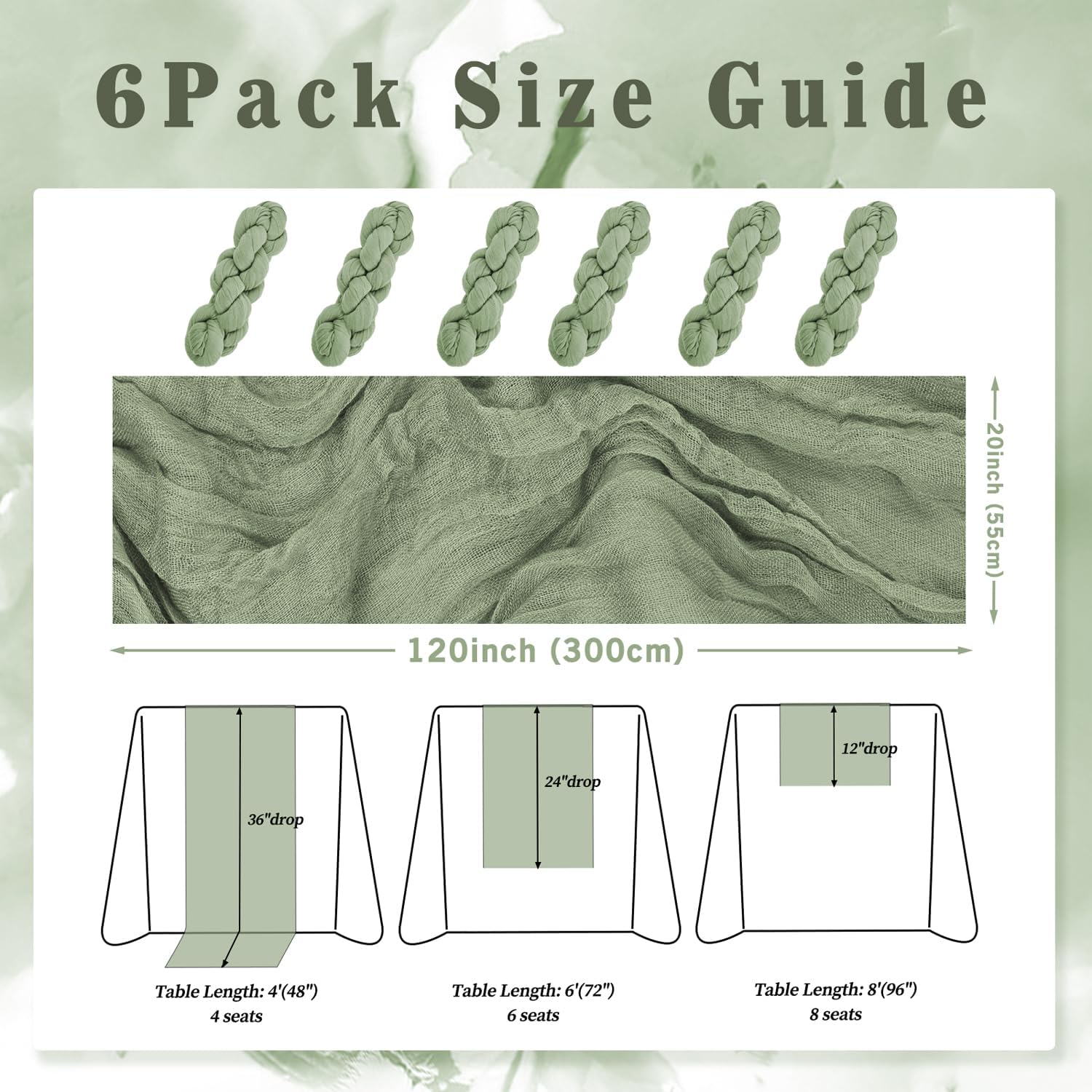 - Cheesecloth Table Runner Size: You will receive 6 sage green cheesecloth tablerunner, each measuring 20 x 120 inches. The quantity is sufficient for you to decorate various romantic occasions. It can decorate most shaped tables, such as rectangular tables, round tables, and cocktail tables. It is long enough to decorate a large table and be placed perfectly and elegantly on the tabletop, adding a romantic atmosphere to your occasion.