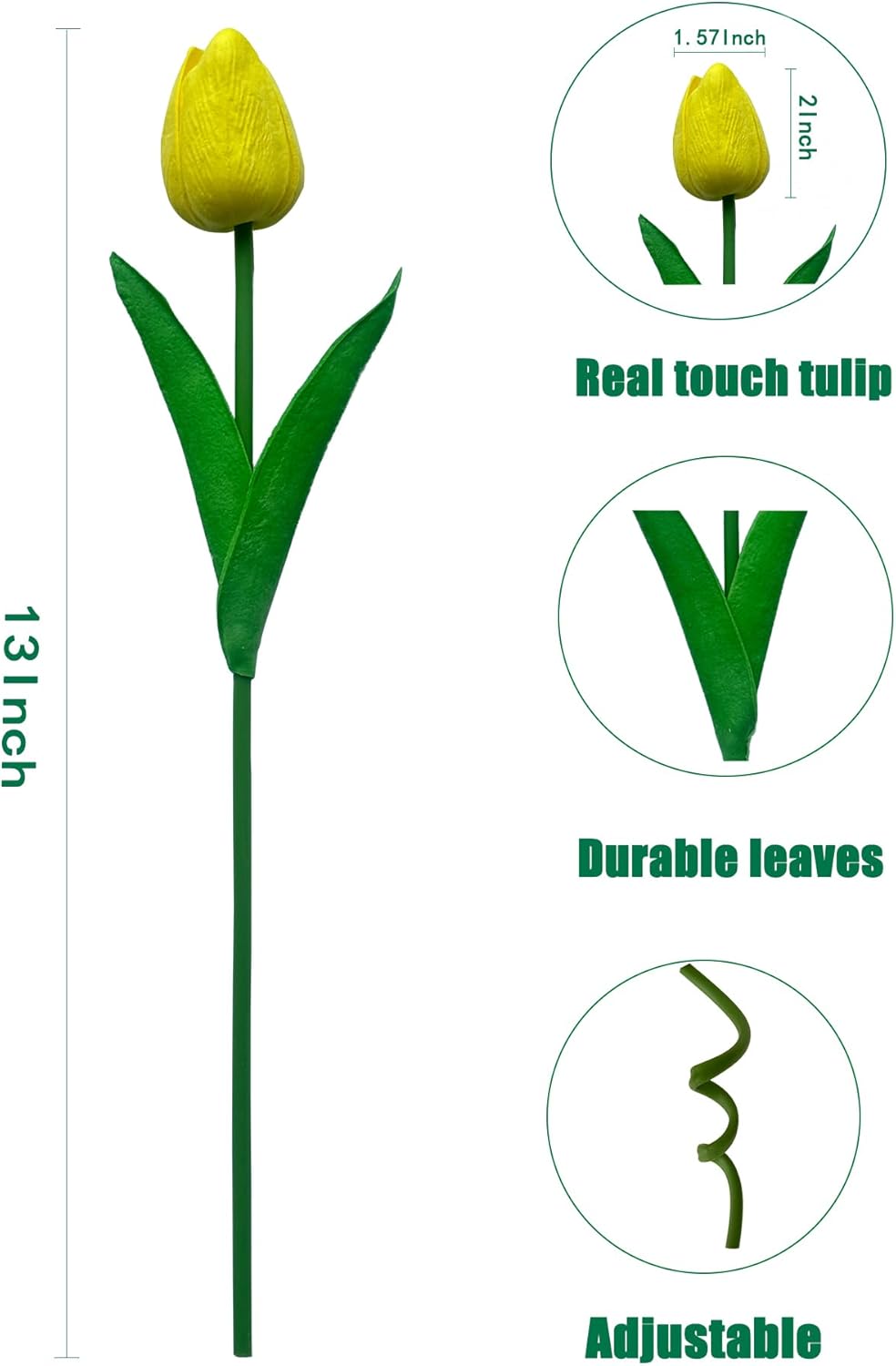 - MATERIAL: Our artificial tulips are made of plastic and polyurethane, which has a soft texture and a realistic touch. Inside the stem is durable wire that can be easily bent and cut to fit different vases as needed