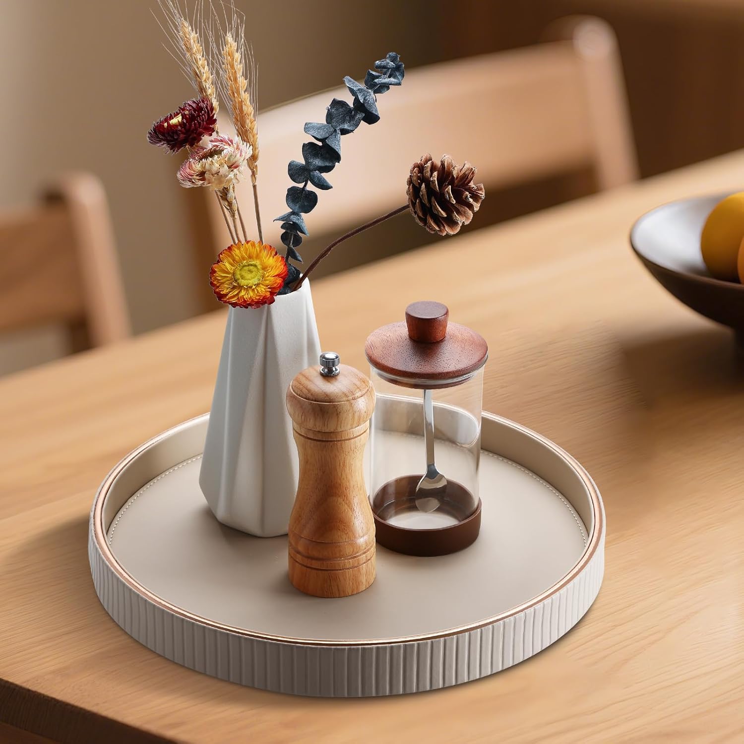 KINGFOM Decorative Serving Tray, PU Leather Valet Nightstand Desk Organizer for Men Women, Round Tray Decor for Coffee Table/Home Decor, Modern Decorative, Centerpiece (Beige)