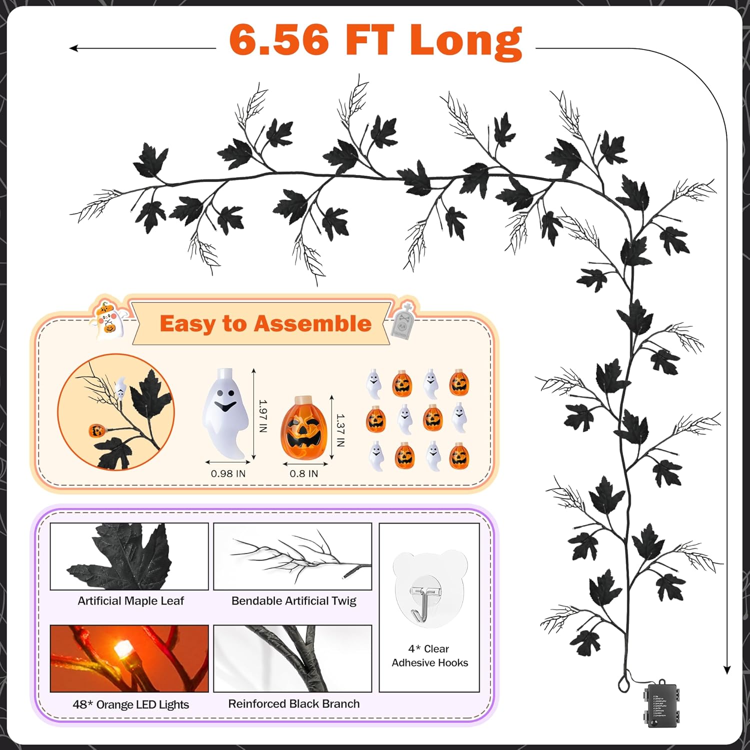 • 8 Changing Modes: Contains 8 lighting modes automatically turns in on timer, warm and bright, gives you the flexibility to adjust the ambiance; 3 AA batteries powered(not included); orange LED lights woven into the vine create an eerie yet cozy atmosphere, brings a festive, spooky touch to Halloween decor