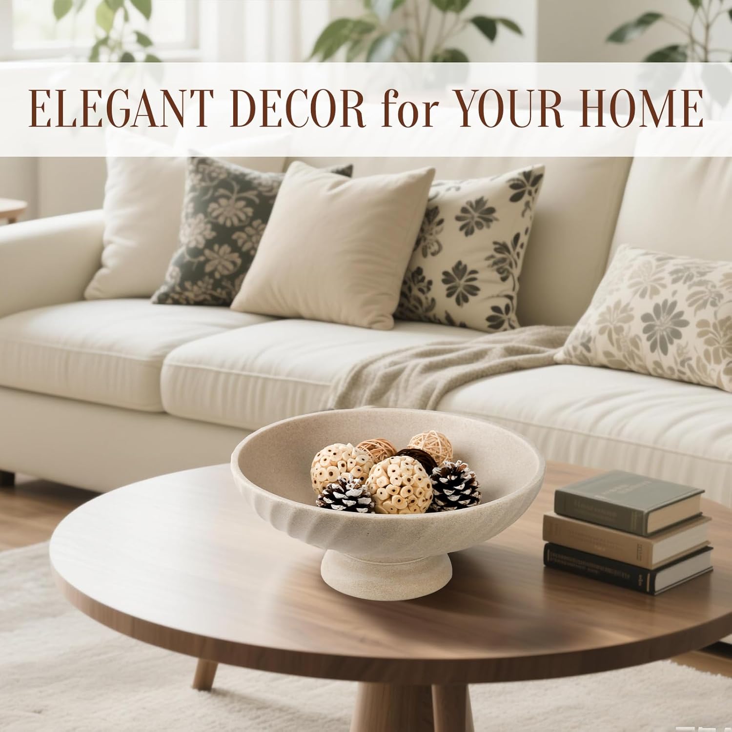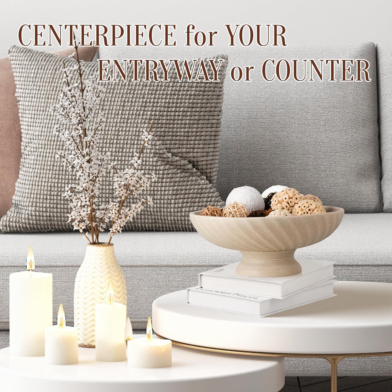 Large Resin Pedestal Decorative Bowl - Modern Fruit Bowl for Kitchen Counter - Handicraft Bowls for Home Decor - Key Bowl for Entry Table,Artificial Stone Beige